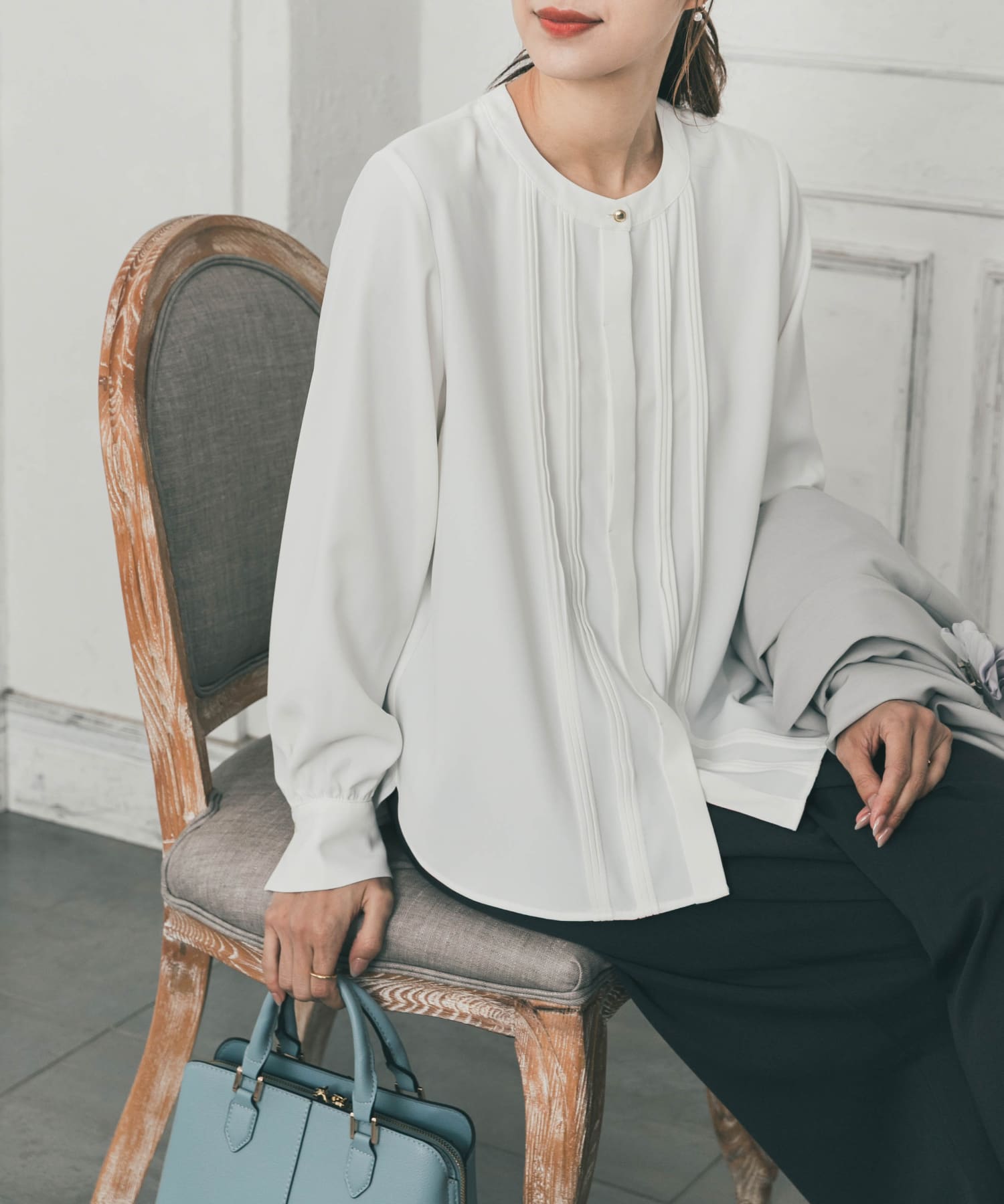 ブラウスは胸元のピンタックデザインと、
