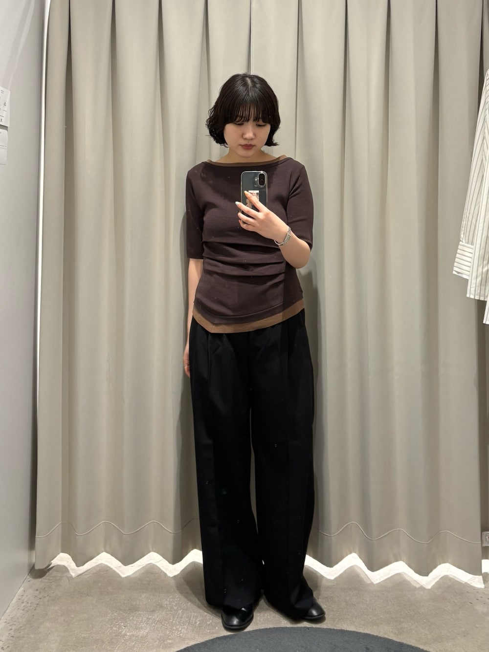 トップス▶︎お腹周りにドレープデザインがあるので、スッキリ見えするデザインになります◎