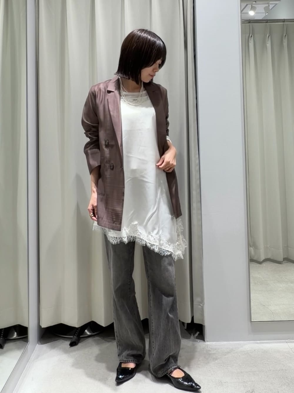 パンツ▶︎膨張しやすい白ですが、ハリ感のある素材で立体的なので実際に履いていただいてもスッキリ見えします!