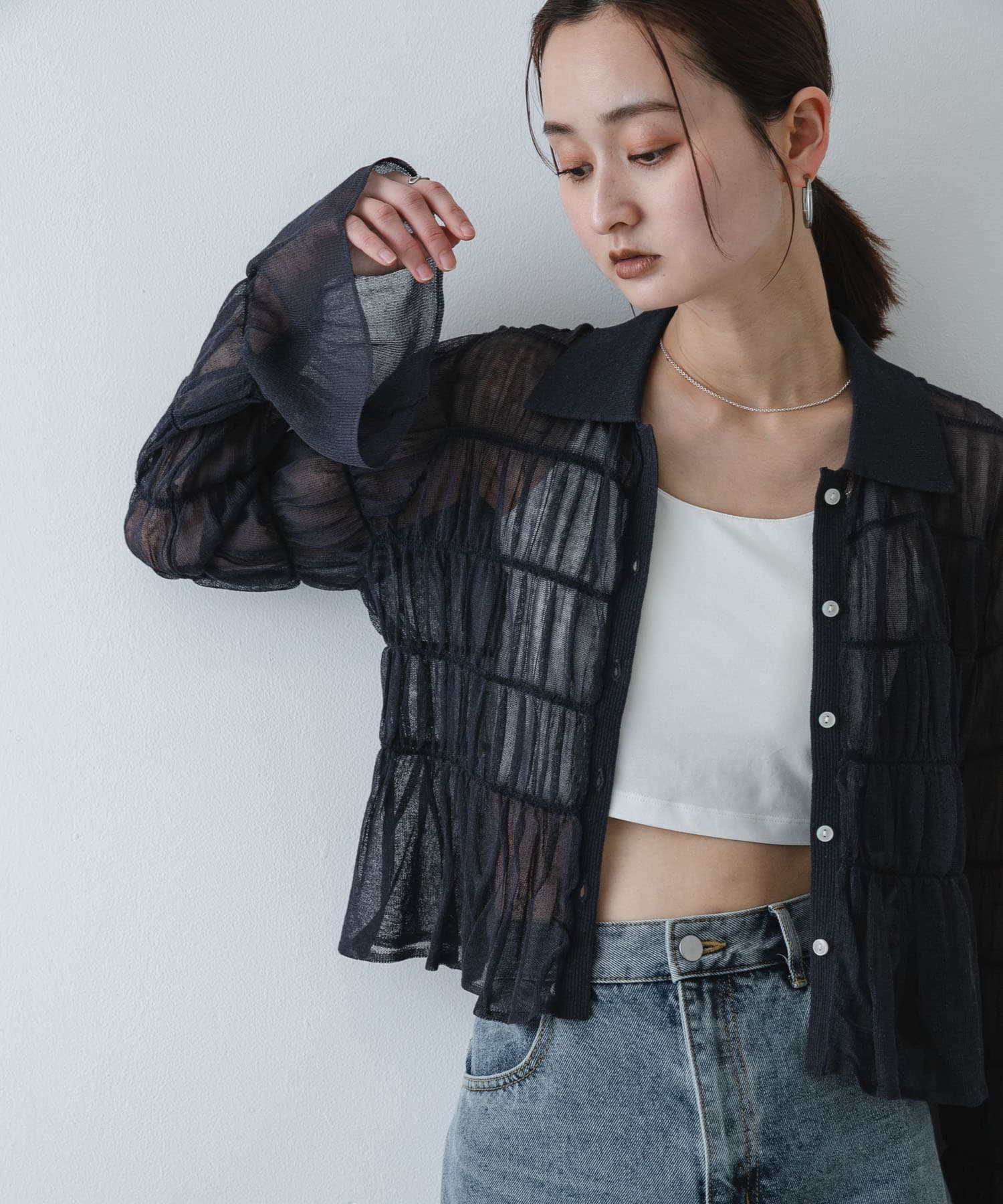 SENSE OF PLACE『洗濯可』シャーリングエリツキニットカーディガン- カラー: