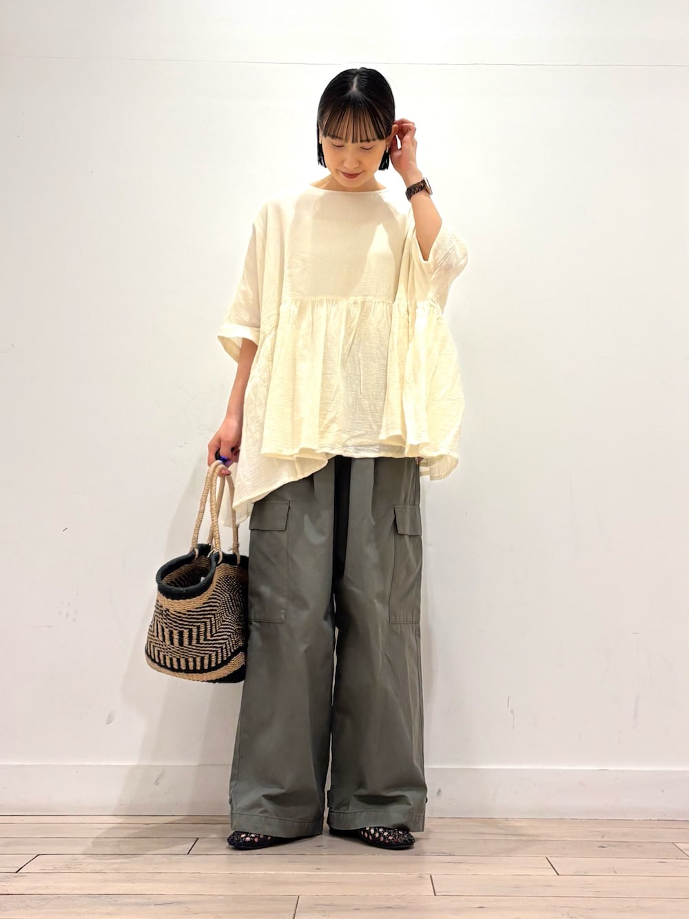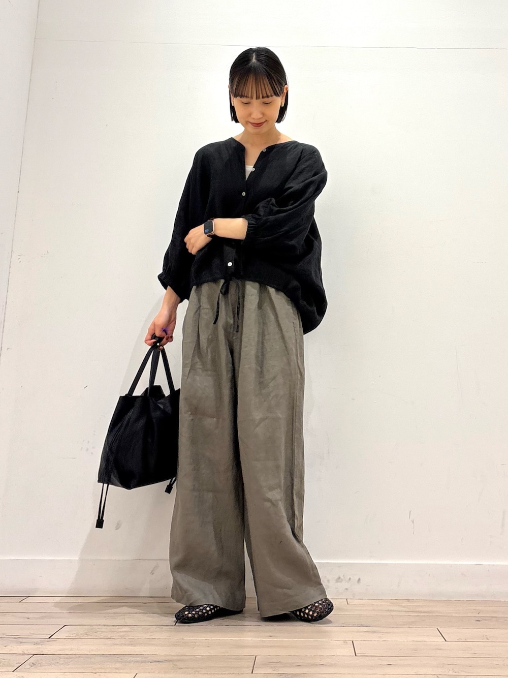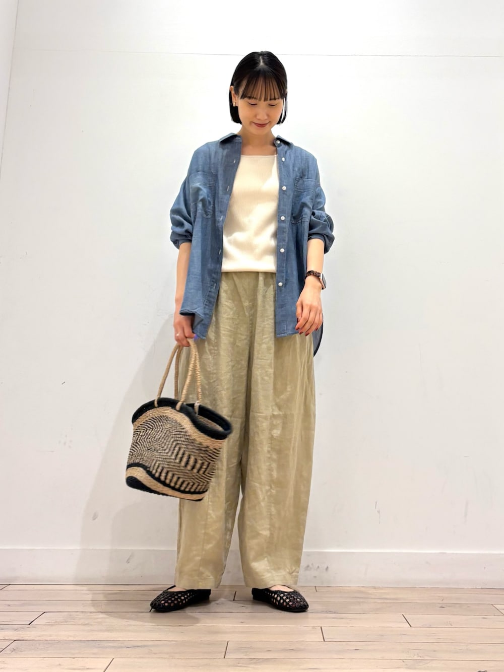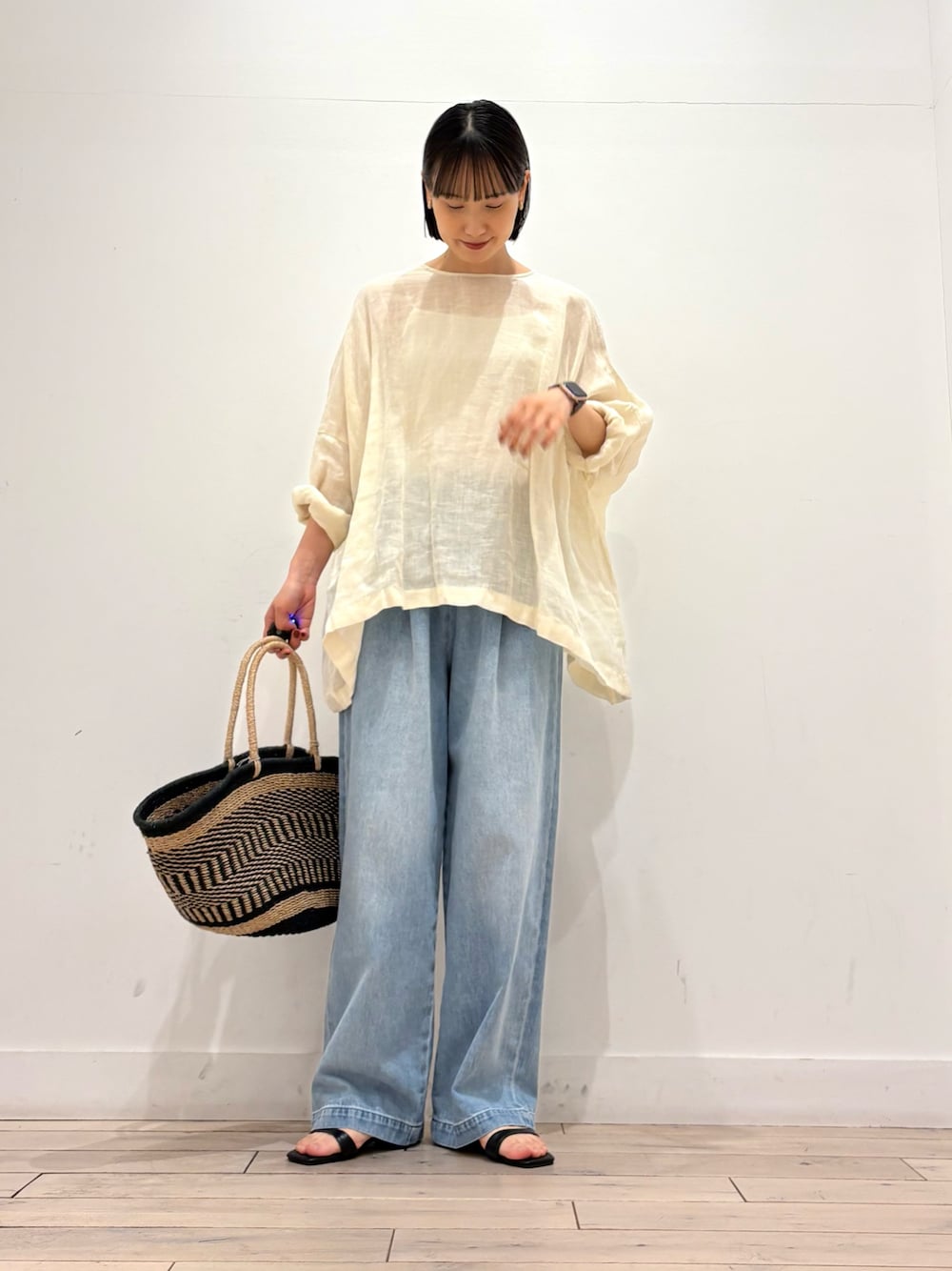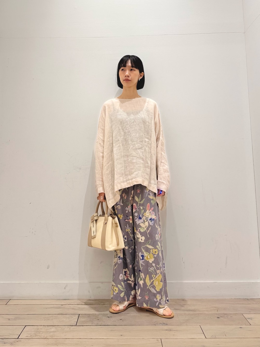 リネンドロストブラウスを前開けで羽織として使用しました。