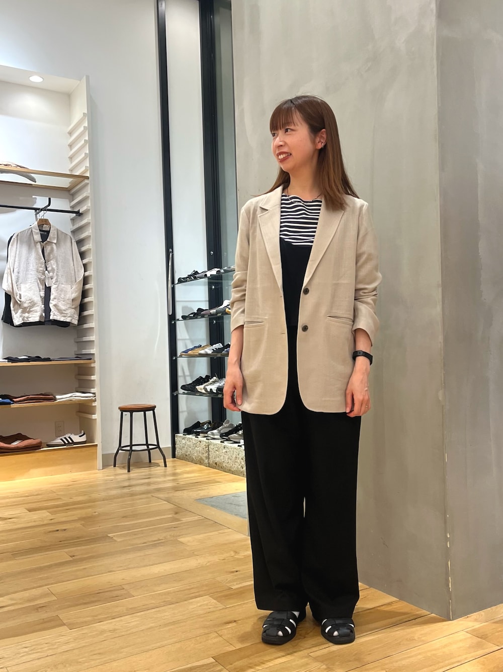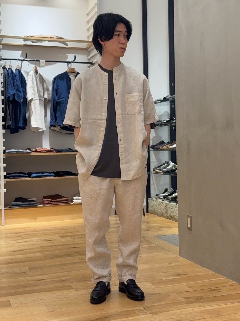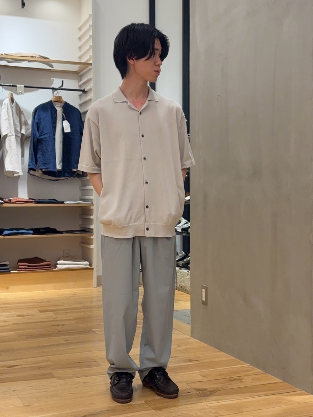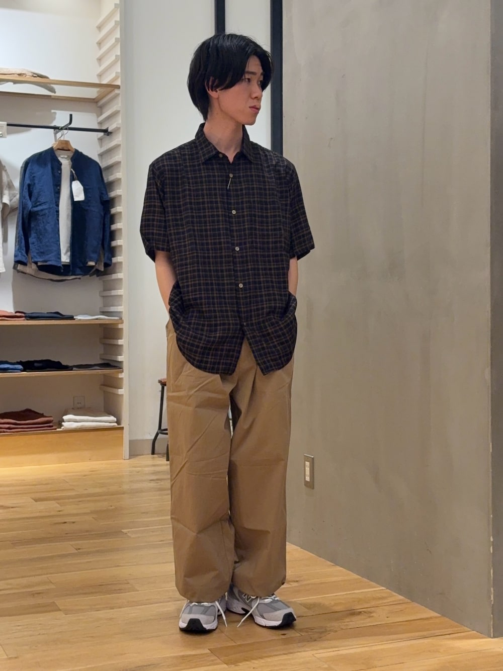 全体的にベージュ、グレーのアイテムでまとめ、シャツの爽やかなグリーンチェックを主役に持ってきました。