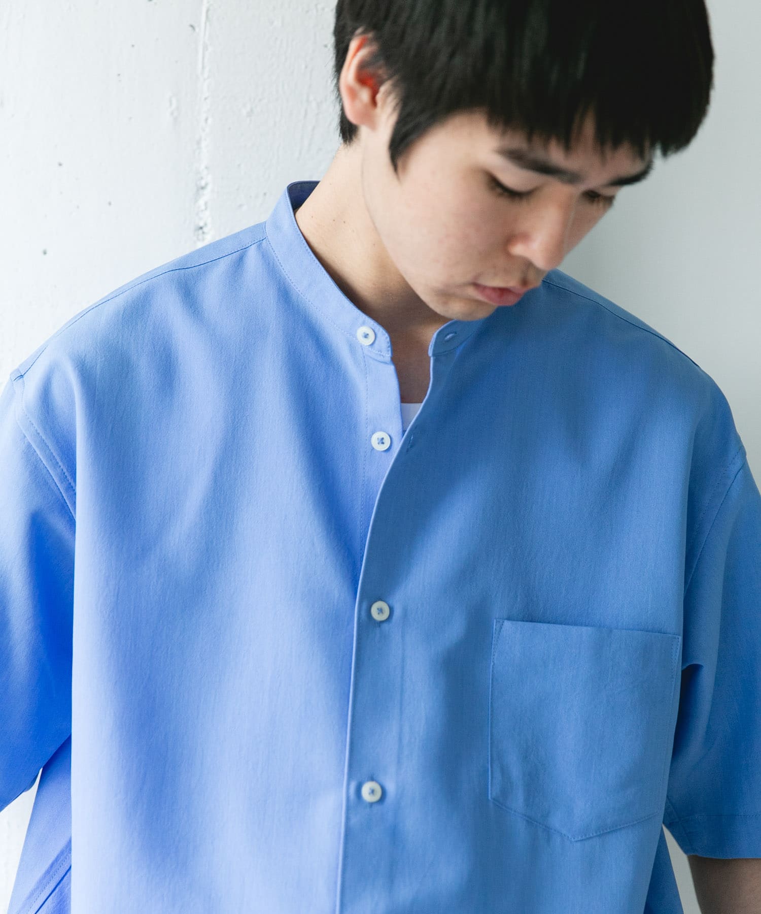 鮮やかな青色のバンドカラーのシャツは、ポリエステル100%の為、シワになりにくく、速乾生がございます。