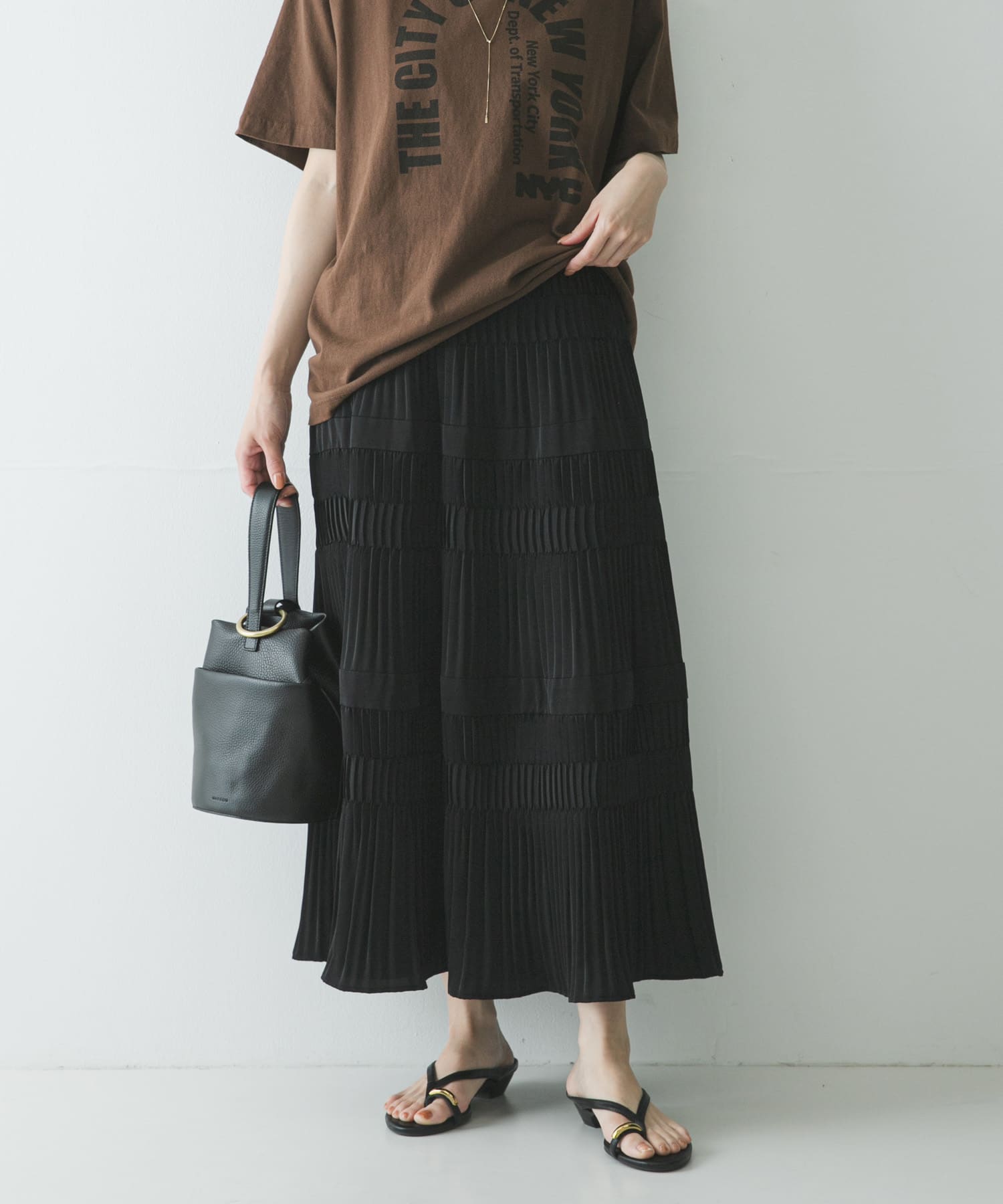 また、Tシャツなどシンプルになりがちなこれからの季節に、プリーツティアードデザインが良く映えます。