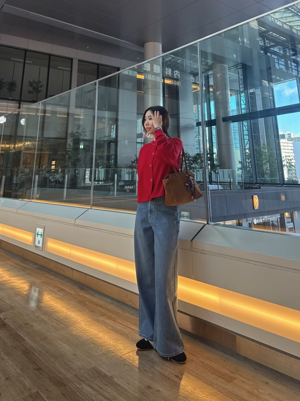 マフラーは、ウールにカシミヤをブレンドした触り心地の良いチェリーレッドのマフラーを着用し寒さ対策を🧣