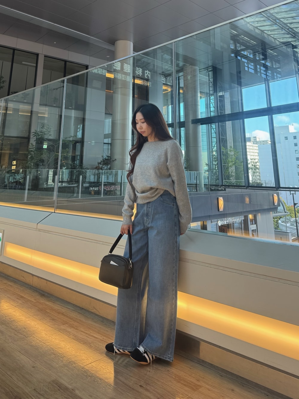 トップスのグレーニットは暖かくて、触り心地が良いウールニットシリーズのプルオーバー!