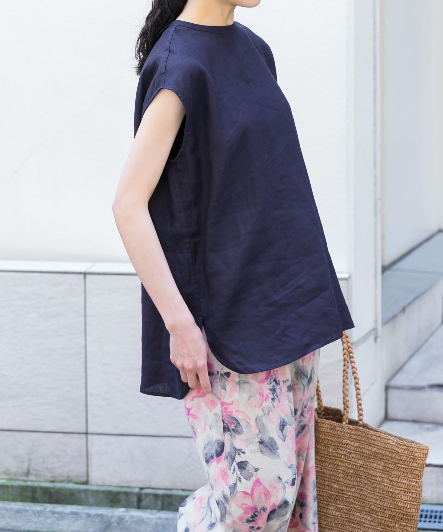 トップスは、柔らかいリネン素材です。肩にかかるフレンチスリーブは、腕まわりをすっきりとみせてくれます。着丈が長めでパンツでもスカートでも合わせやすいです◎