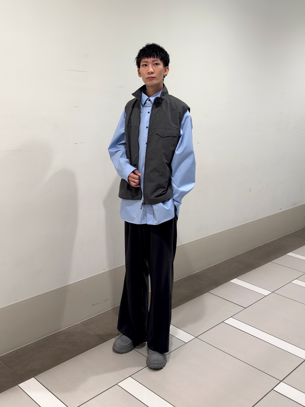 アウターのナイロン系素材、インナーのウール調の質感、そしてボトムスの深みのあるリジッドのデニムで合わせ、ワントーンに近い配色でものっぺりせず、奥行きのある着こなしにしてみました。