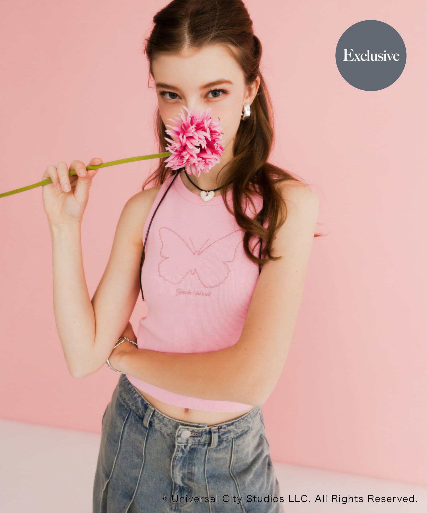 タンクトップの鮮やかなピンク色を主役にしたカジュアルコーデです!