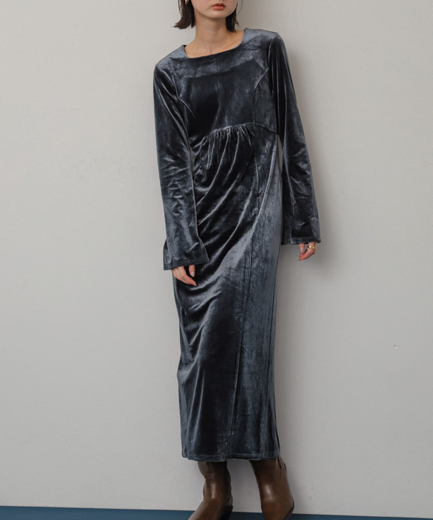 ベロアの光沢がきれいなワンピースは高い位置にウエストマークされているので脚長効果◎