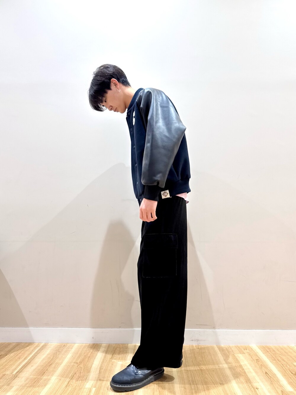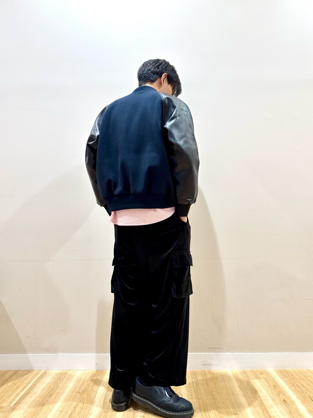 パンツにはベロアのカーゴパンツを入れることで異素材ながらもこなれた印象を出してくれ、