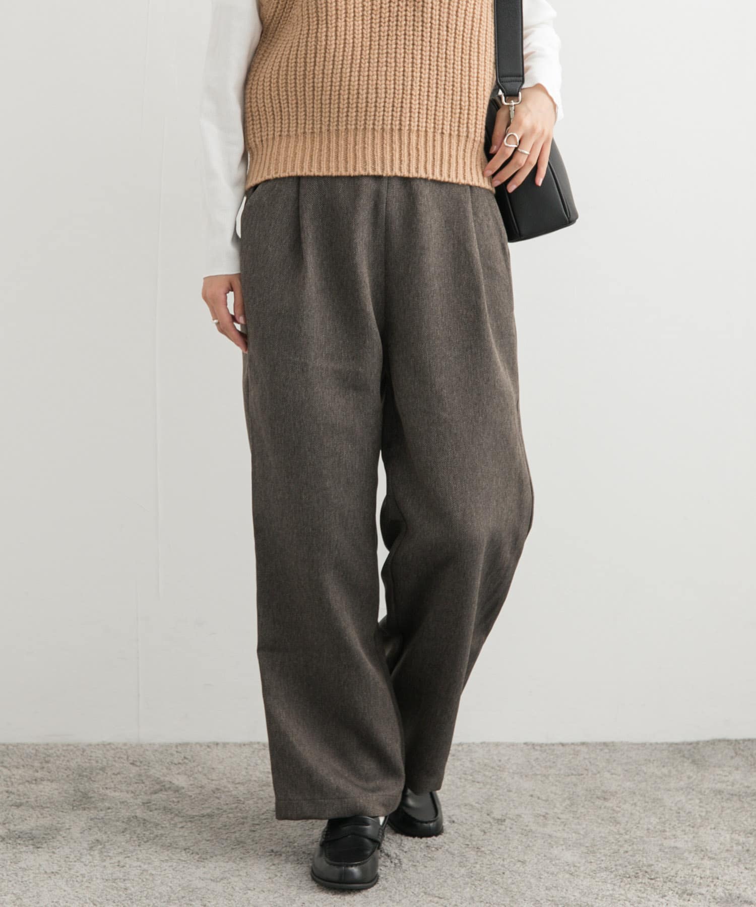 ボトムは昨年人気だったアイテムでさらっとしており、ウエストも締め付け感のないバックゴムで楽ちんながらもキレイめからカジュアルまで幅広くスタイリングしていただきやすいです。