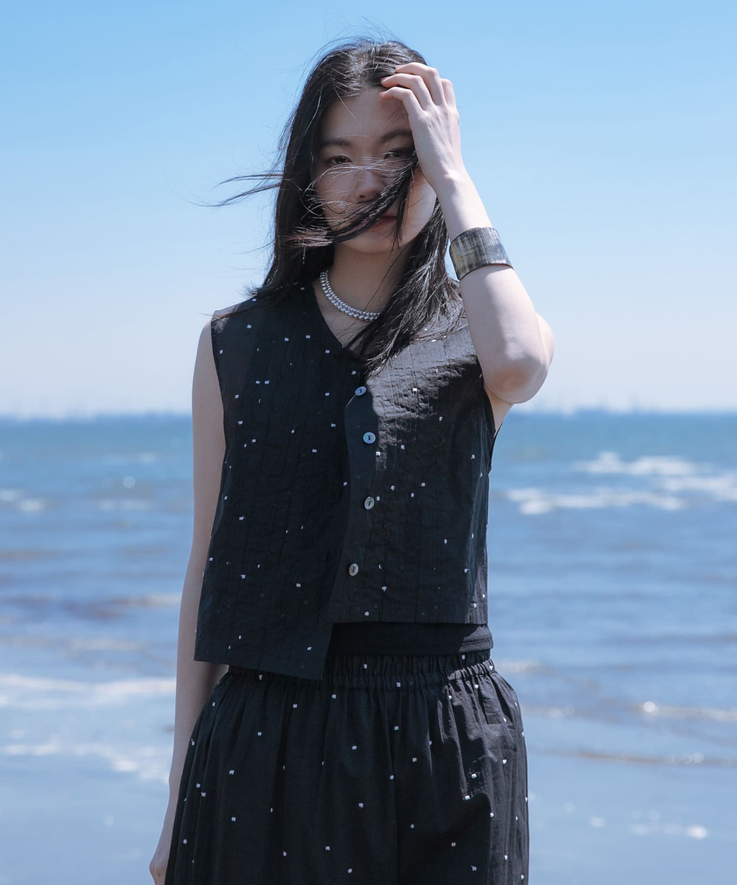 夏でも黒を着たい!という場合は、シアー素材や透け感のあるものを持ってくるのが涼しげに見えて⭕️