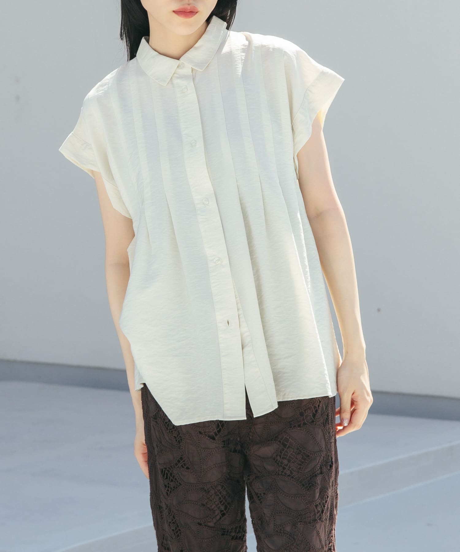ブラウスはサラッとした生地感でオンオフ