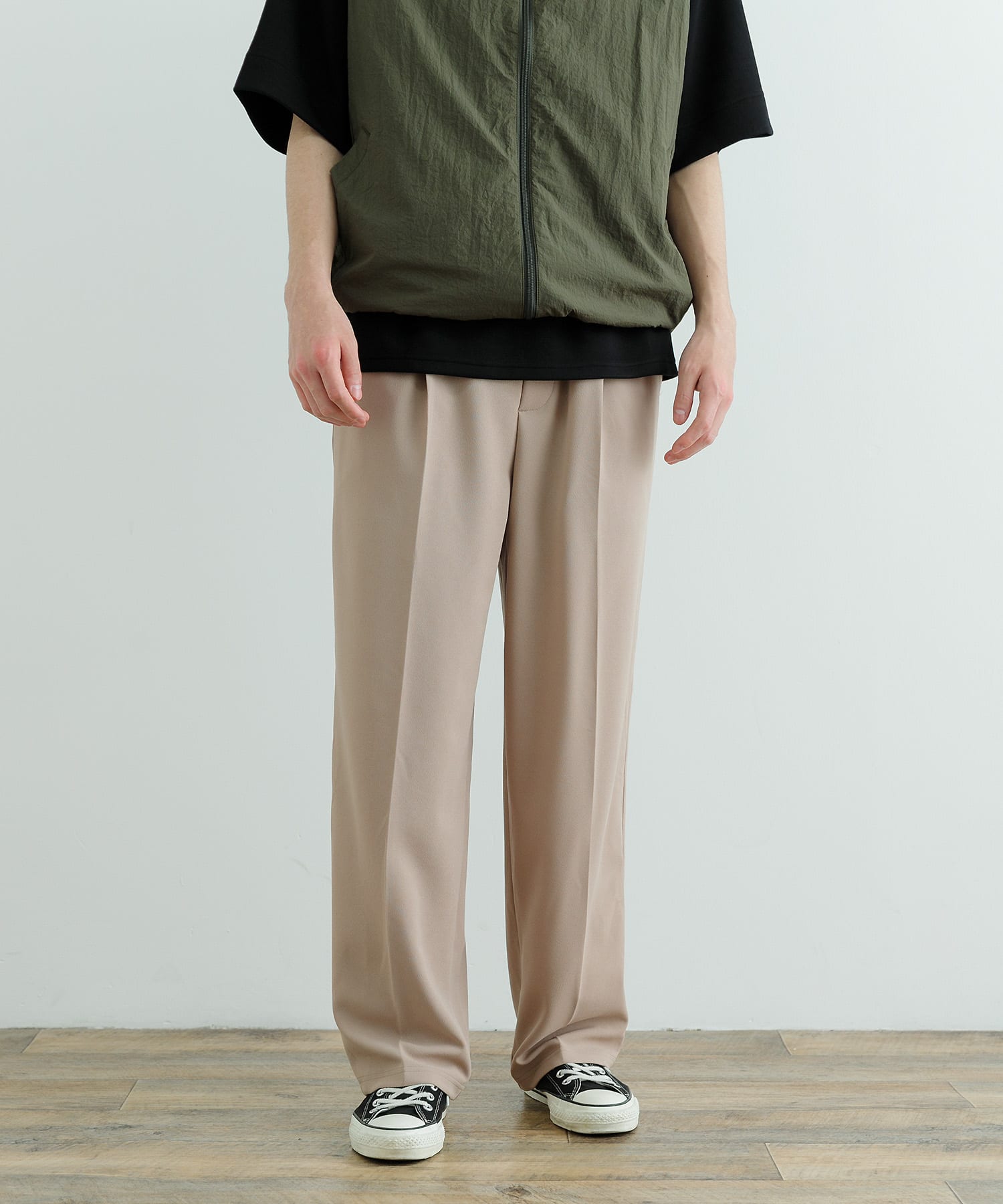 パンツはベージュのスラックスにして夏の終わりから秋の入りまで楽しめるスタイリングに。