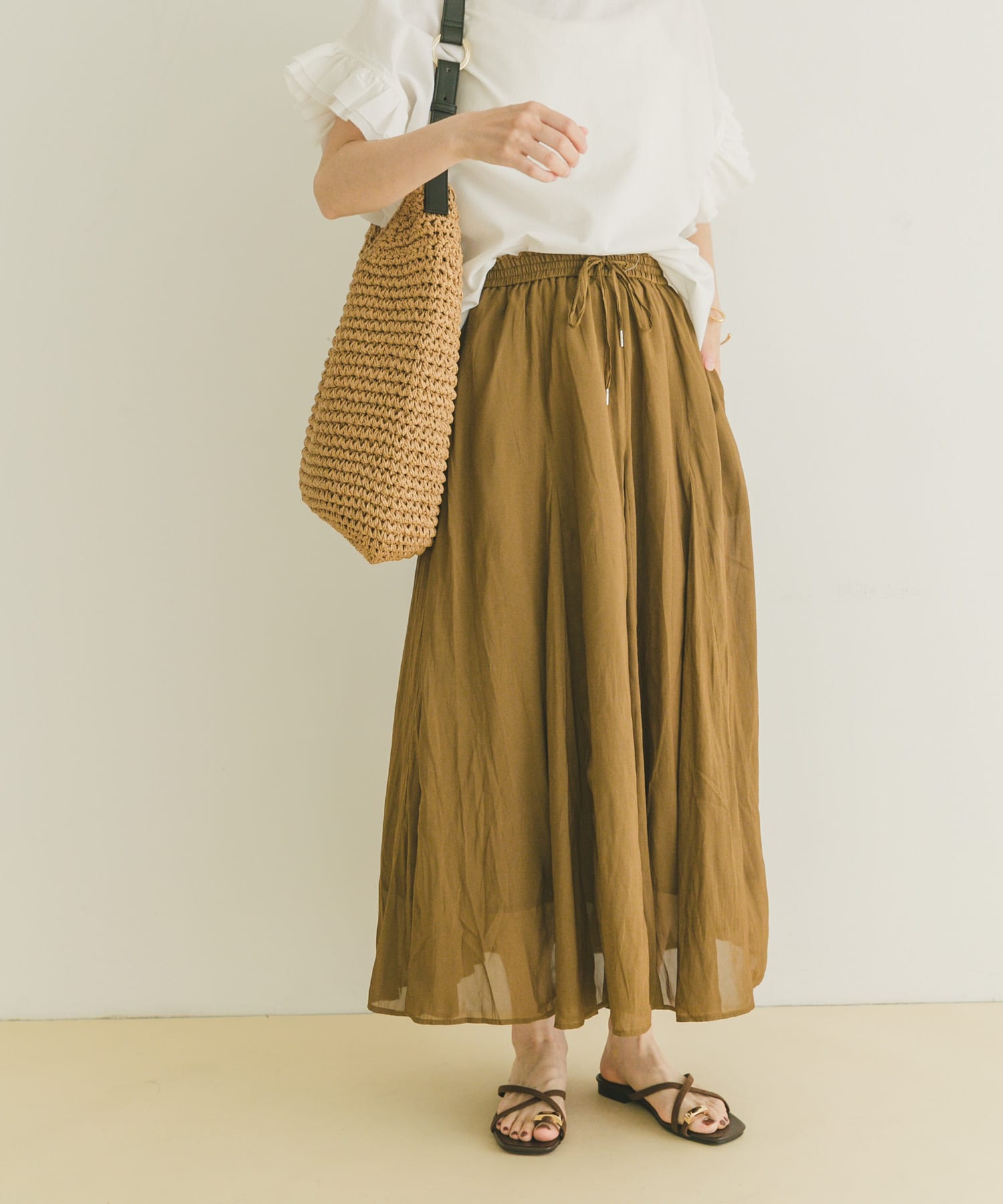 シアーのフレアスカートを合わせて王道なキレイめカジュアルに。