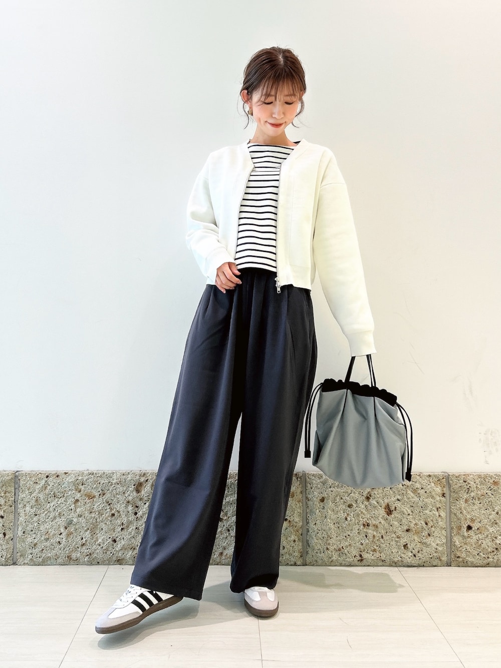 インナーにブルー×ホワイトのボーダートップスを合わせてシンプルで爽やかに🌱