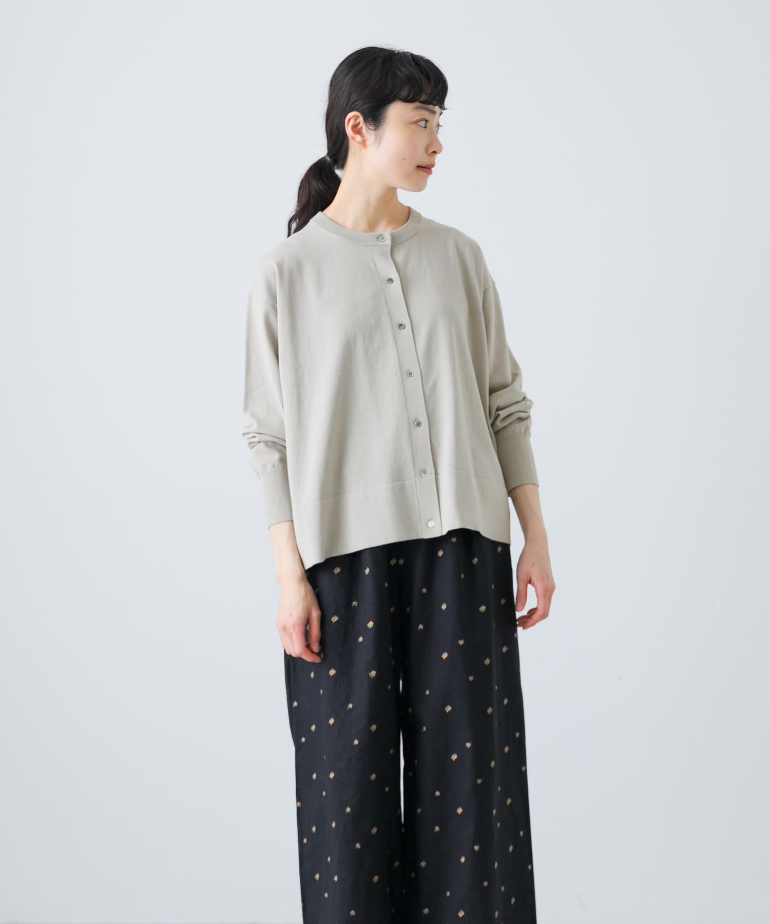 ライトグレーのハイゲージコットン素材で仕立てた、クルーネックのカーディガン。