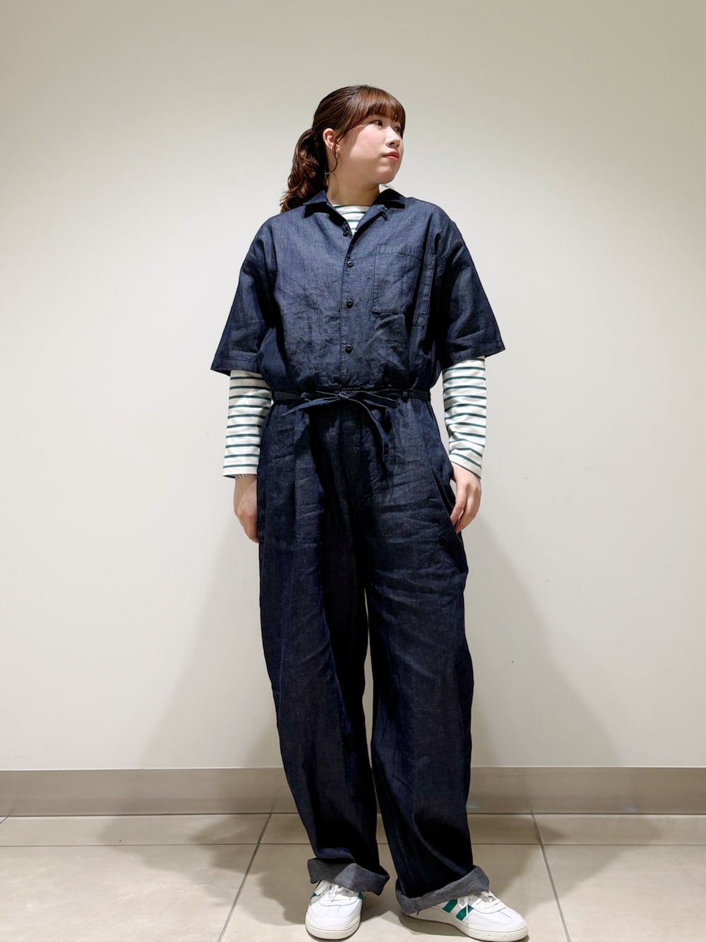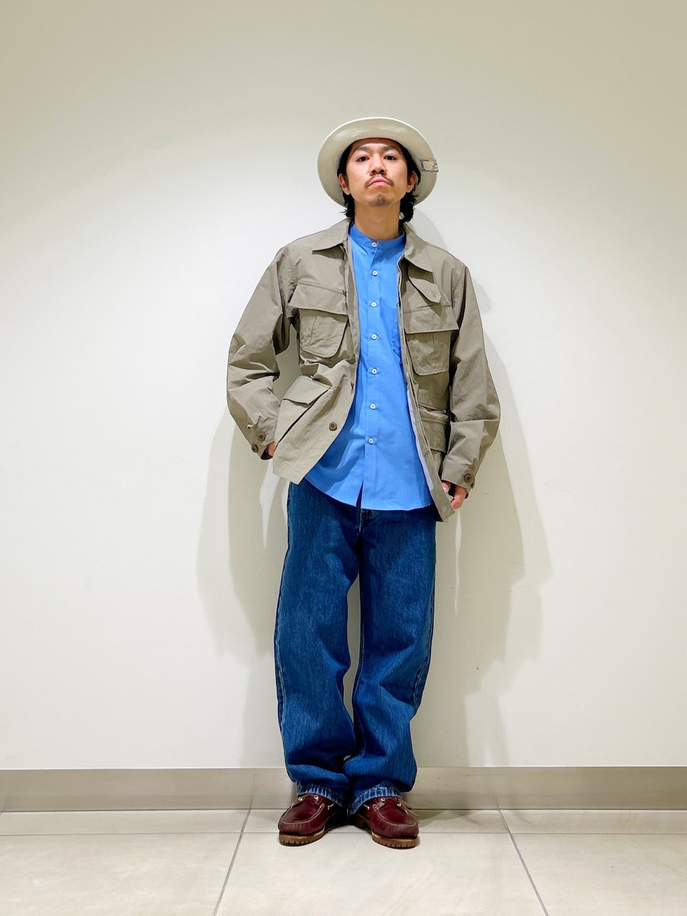 今回はナイロンタッサーシャツとリネンライクトラウザーを使用したコーディネート。