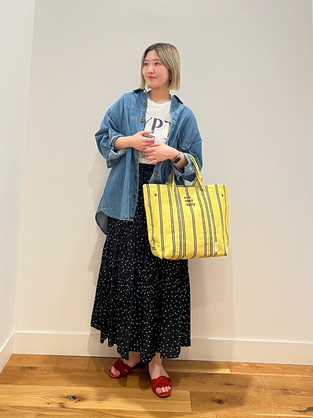 シャツは長めの着丈なのでスカートもスッキリ見えるプリーツスカートでしたらボリューム出しすぎず着やすいです。