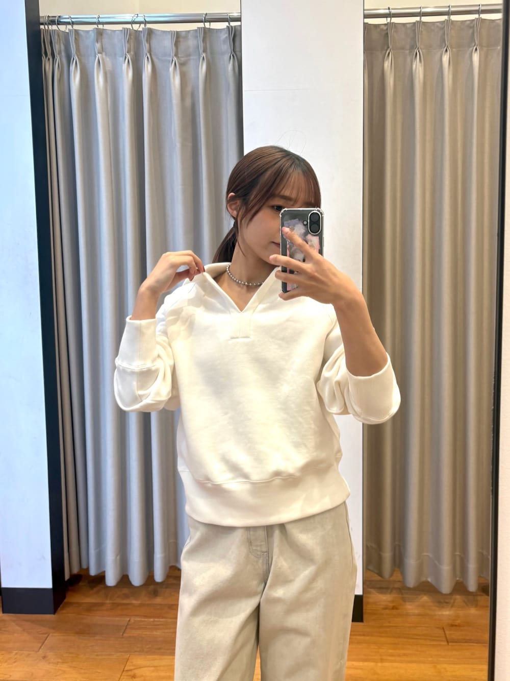 パンツはタックギャザーストレートパンツで、幅広いワイド好きな方におすすめアイテムです!私の身長で36をウエスト1回折って履いてます!今はサンダルで合わせてますが、秋ごろになればローファーやヒールなどにも合うと思います!