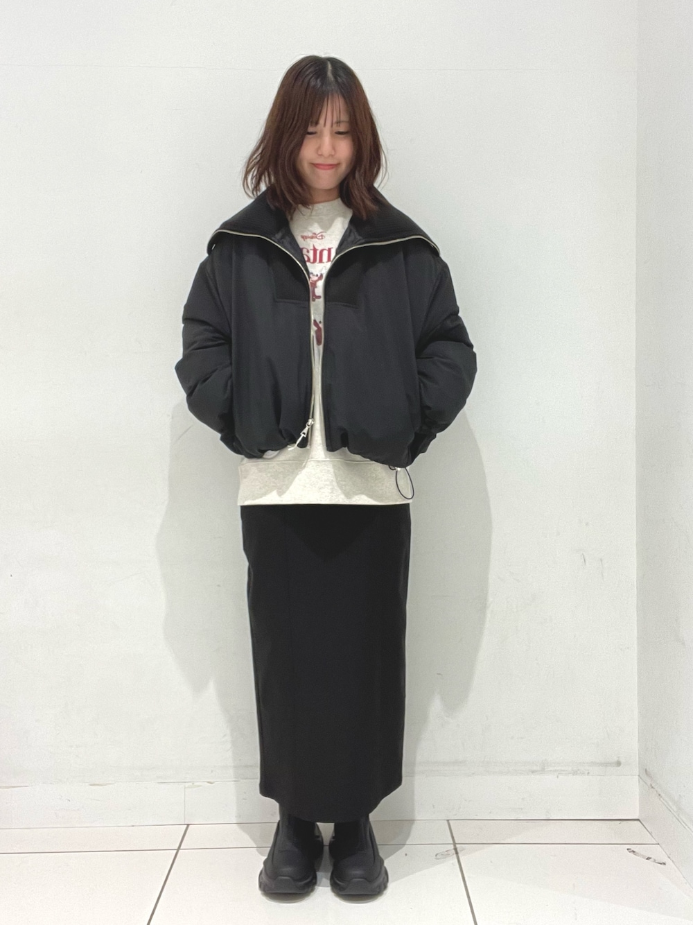 スカートは光沢感のある素材を使用してあるので、カジュアルになりすぎないのがポイントです♪
