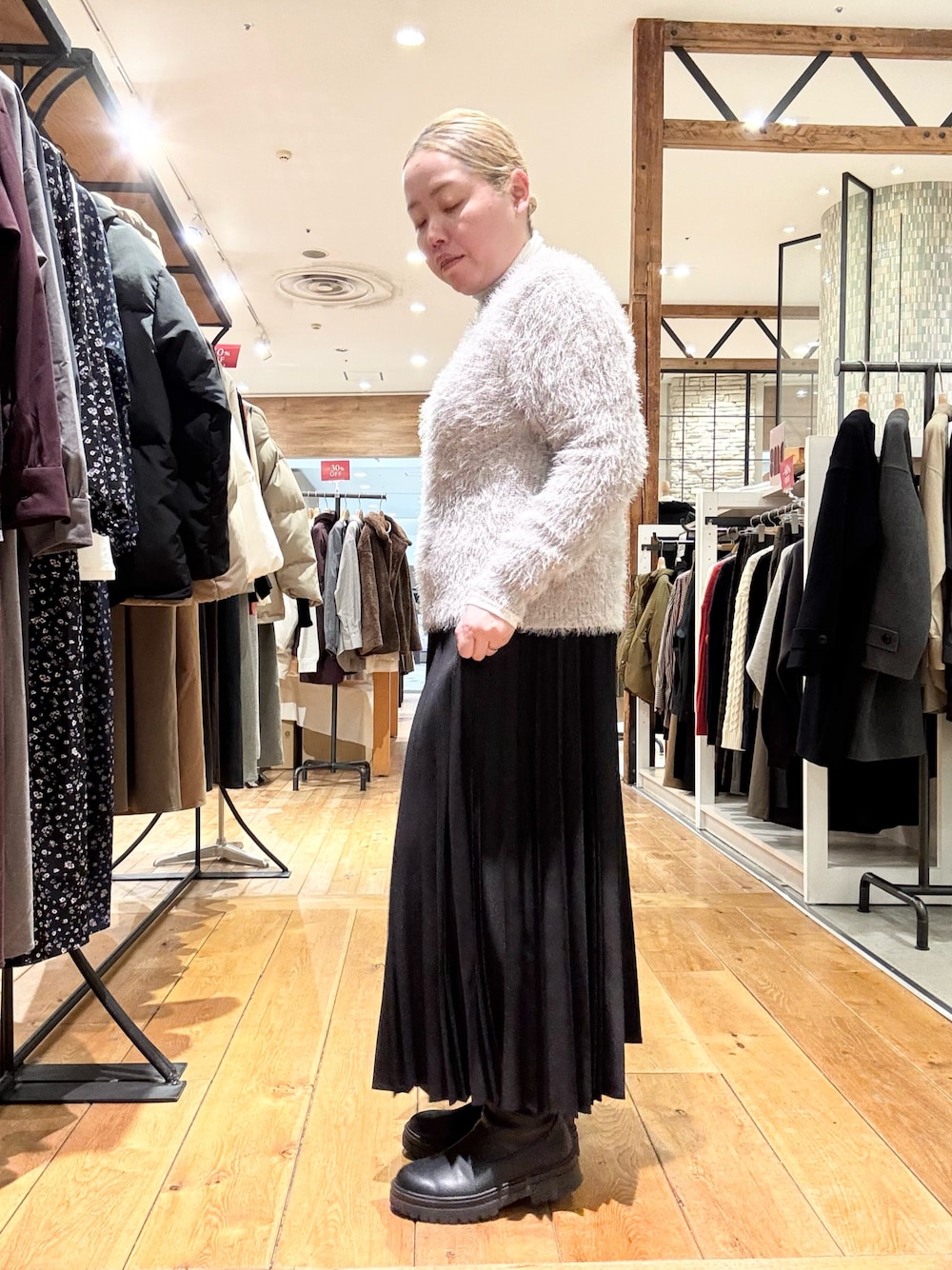 他のアイテムは黒でシンプルですが、シンプルな中にも、スカートはレザーライクだったり、バッグはラメが入っていたりと、少し個性が入っているアイテムを選んでいます。