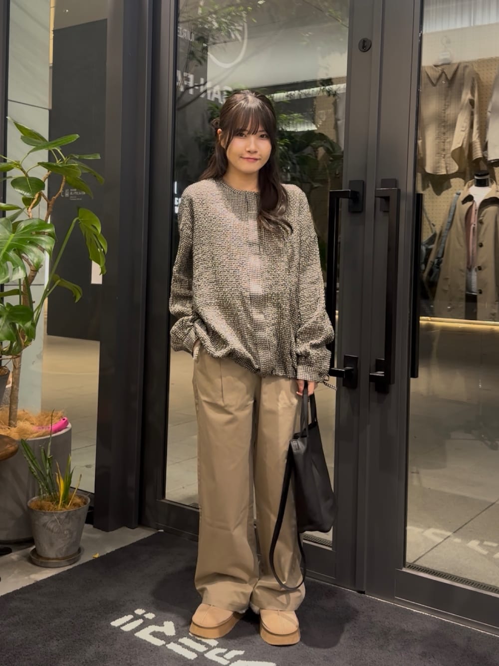 シアーのオーガンジーブラウスと黒のスラックスのキレイめなスタイリングです!