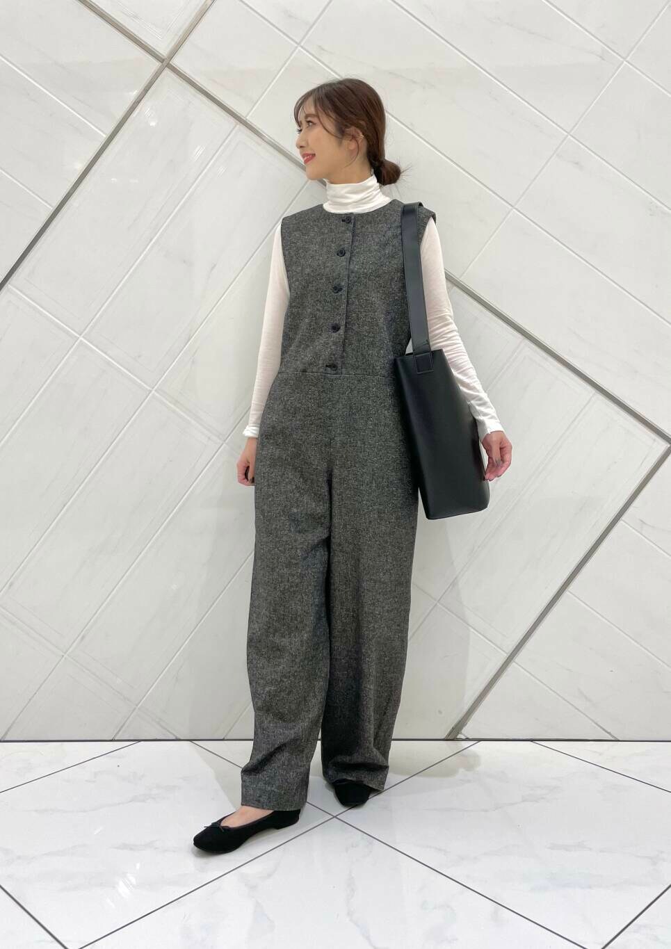 上品な印象のツイード生地のオールインワンにシアー感のあるカットソーをプラスしました。