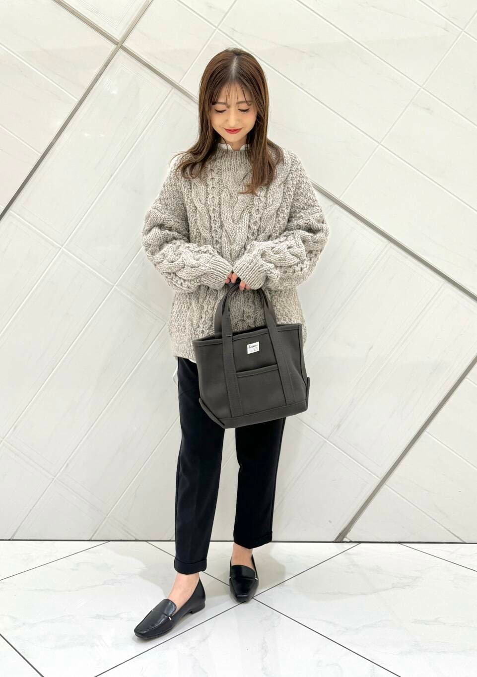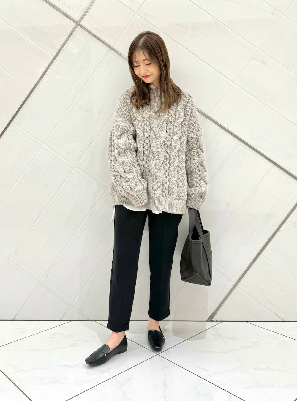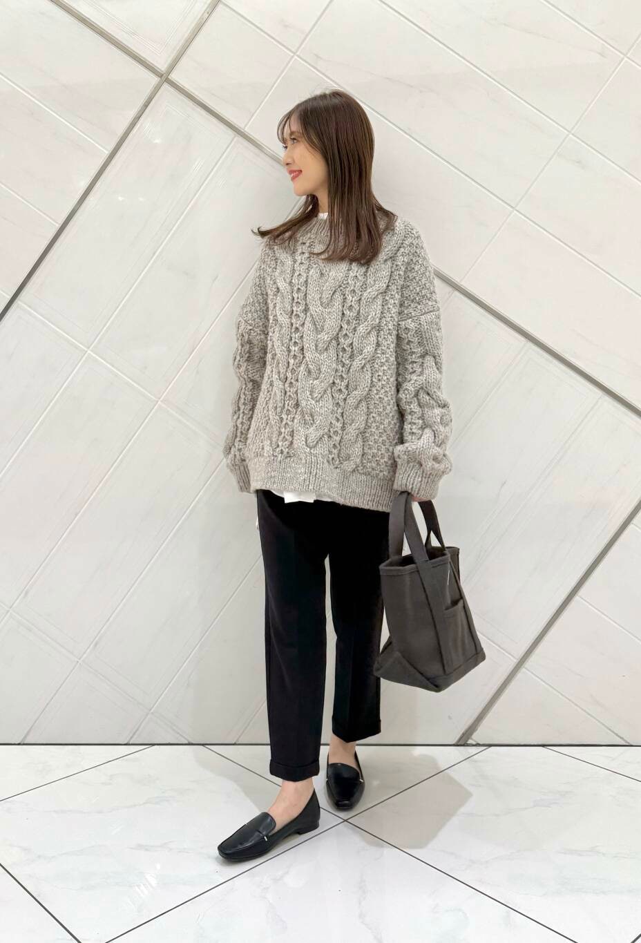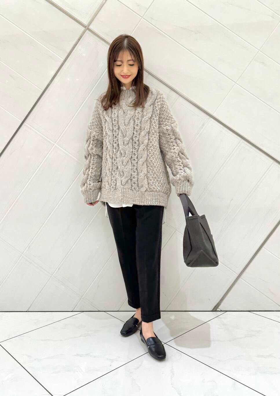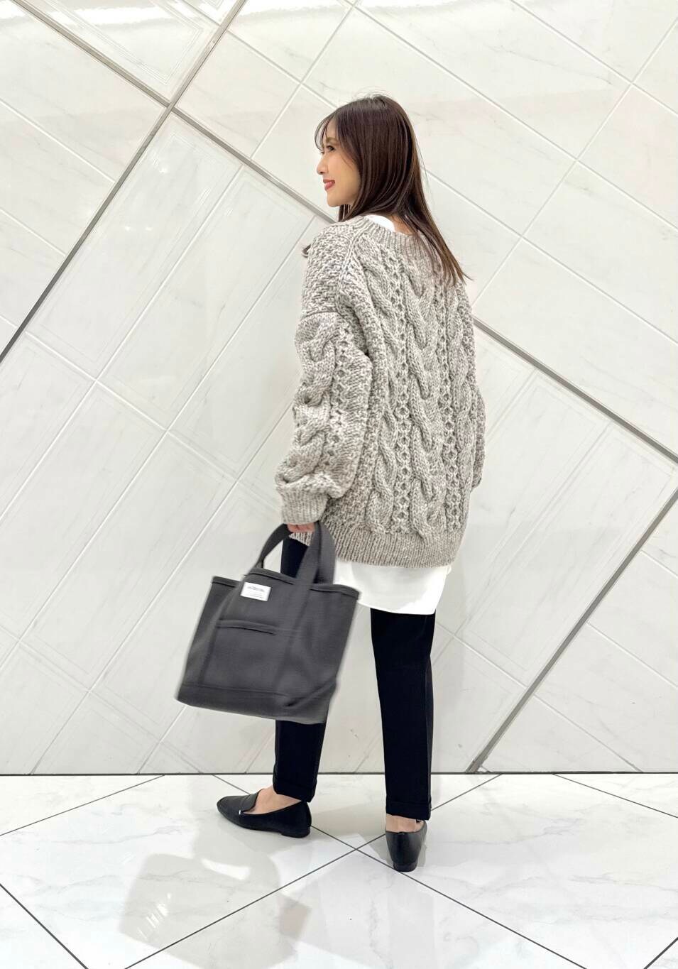 1枚で主役になるアイテムですが、チュニック丈のシャツを合わせて、軽さを出しました。