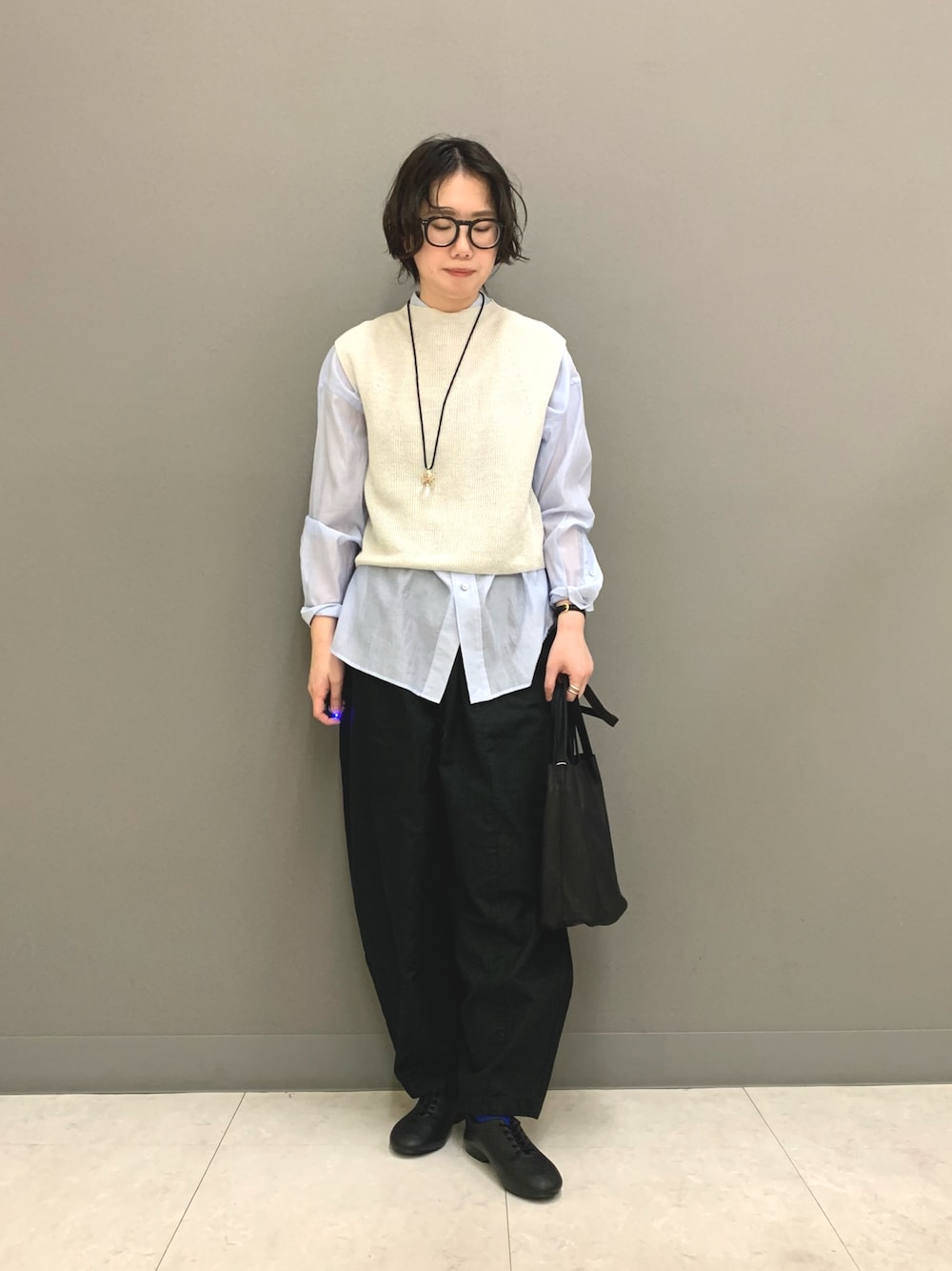 ポロシャツ風のカーディガンは一枚で着てもいいですがインナーにカットソーやタートルネックを入れてもかわいいです。今回はパールネックレスを合わせて、ほんの少しの女性らしさを加えてみました*