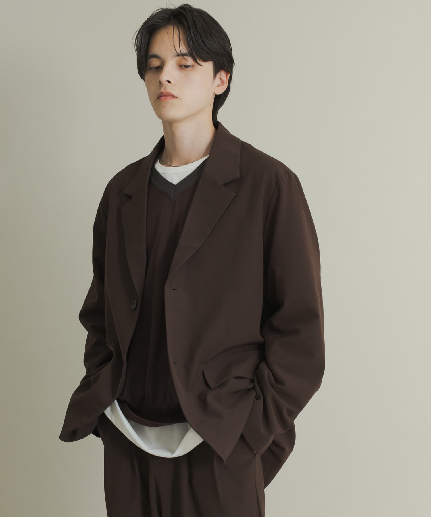 ブラウンのジャケットはカッチリ感出にくく普段使いもしやすいと思います!
