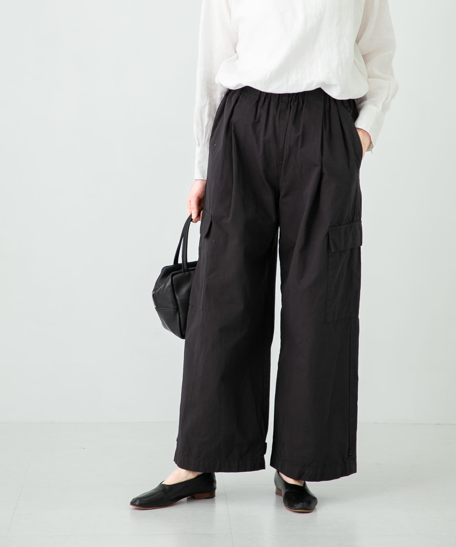 定番のユーティリティパンツはスミクロのカラーだとカジュアル過ぎずにお使いいただけます。ワイドストレートのシルエットでかっこいい印象です。フリルブラウスの甘めな雰囲気と良いバランスになるかなと思います。
