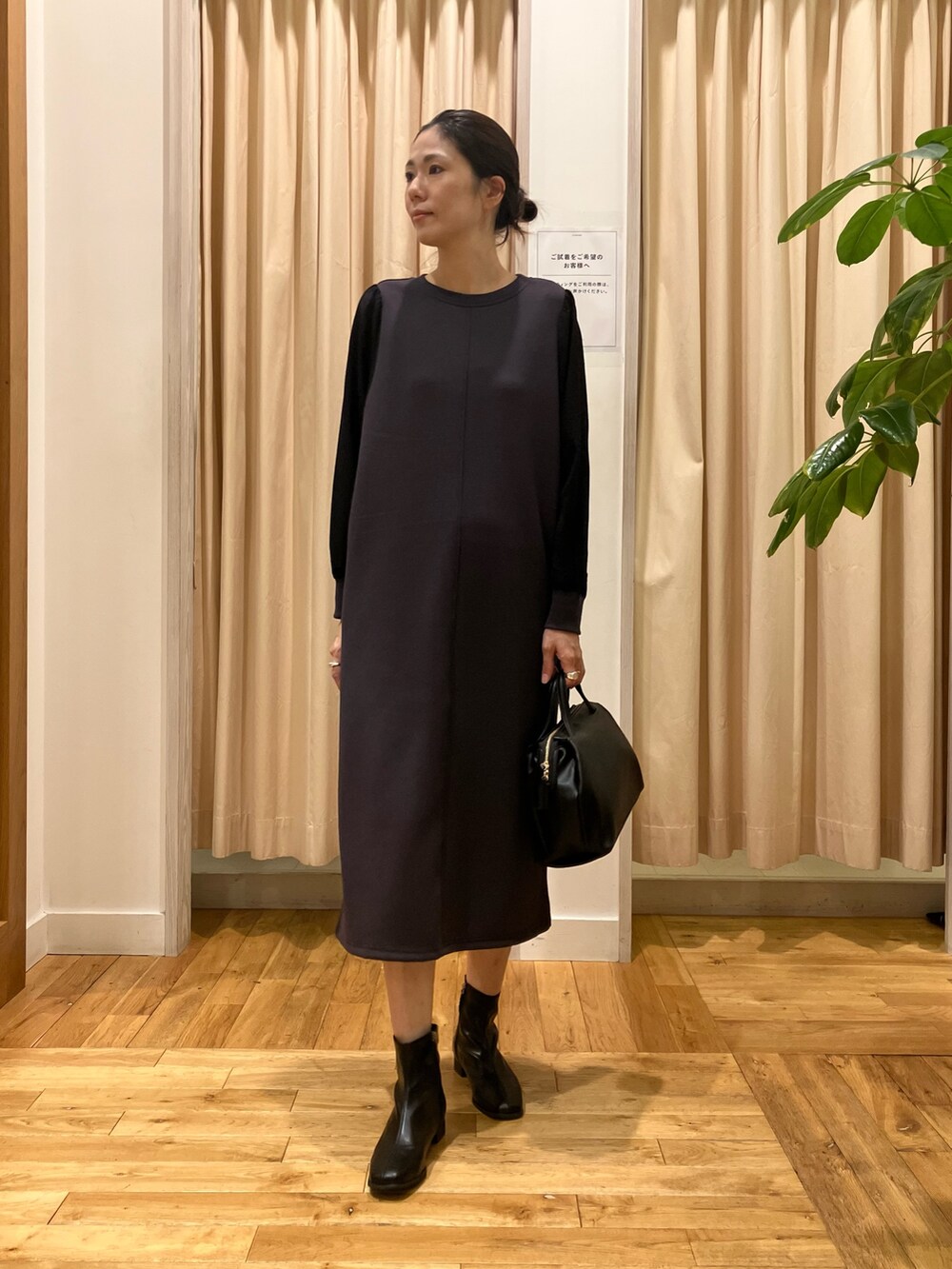 お袖の異素材ドッキングがポイントのワンピース。見頃はダンボールニットで、つやのあるスウェットのようなお素材なので、きれいめな雰囲気に仕上がります。