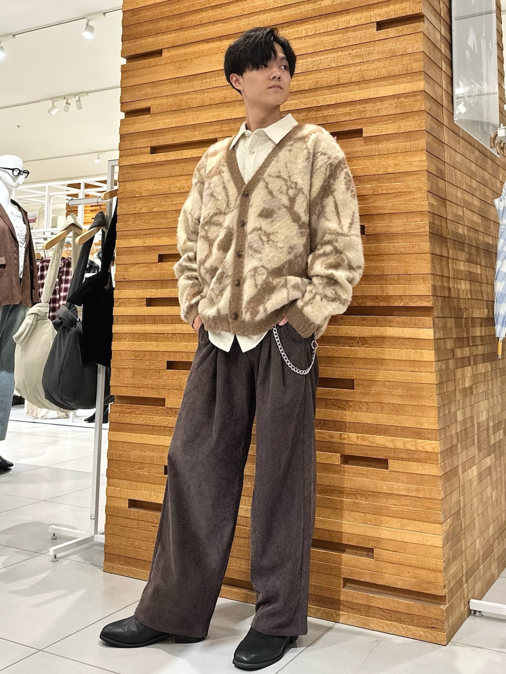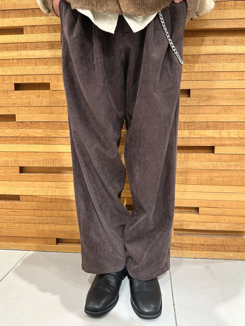 ちっちゃなブロックが並んでいるコーデュロイパンツです!その模様により光沢感があり、落ち着いた雰囲気を出しながらもオシャレ度を上げてくれるのでおすすめです!