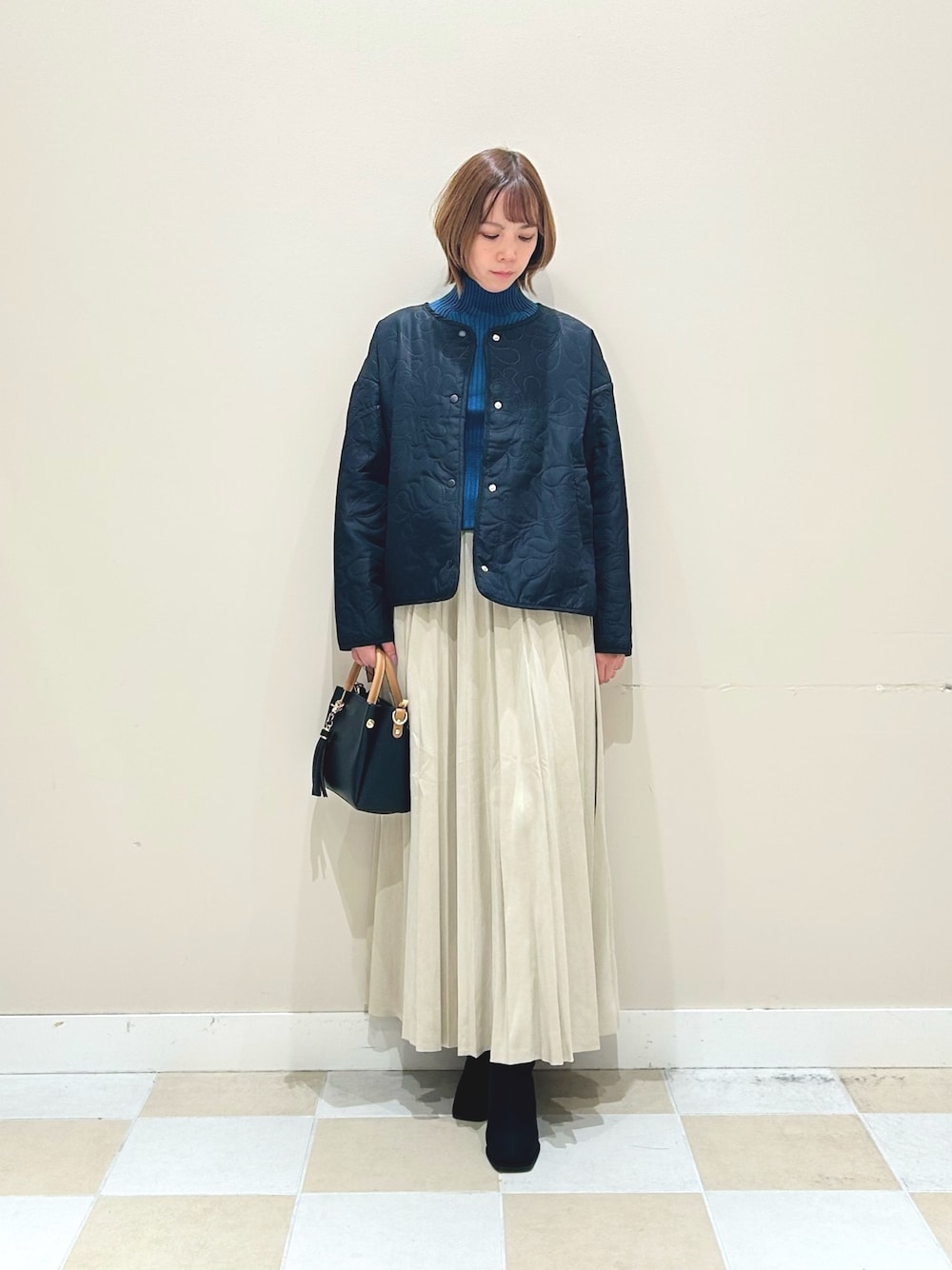 ふわふわな手触りの薄手のVネックニット、スエード調のタイトスカートとブーツで秋スタイルにしました!