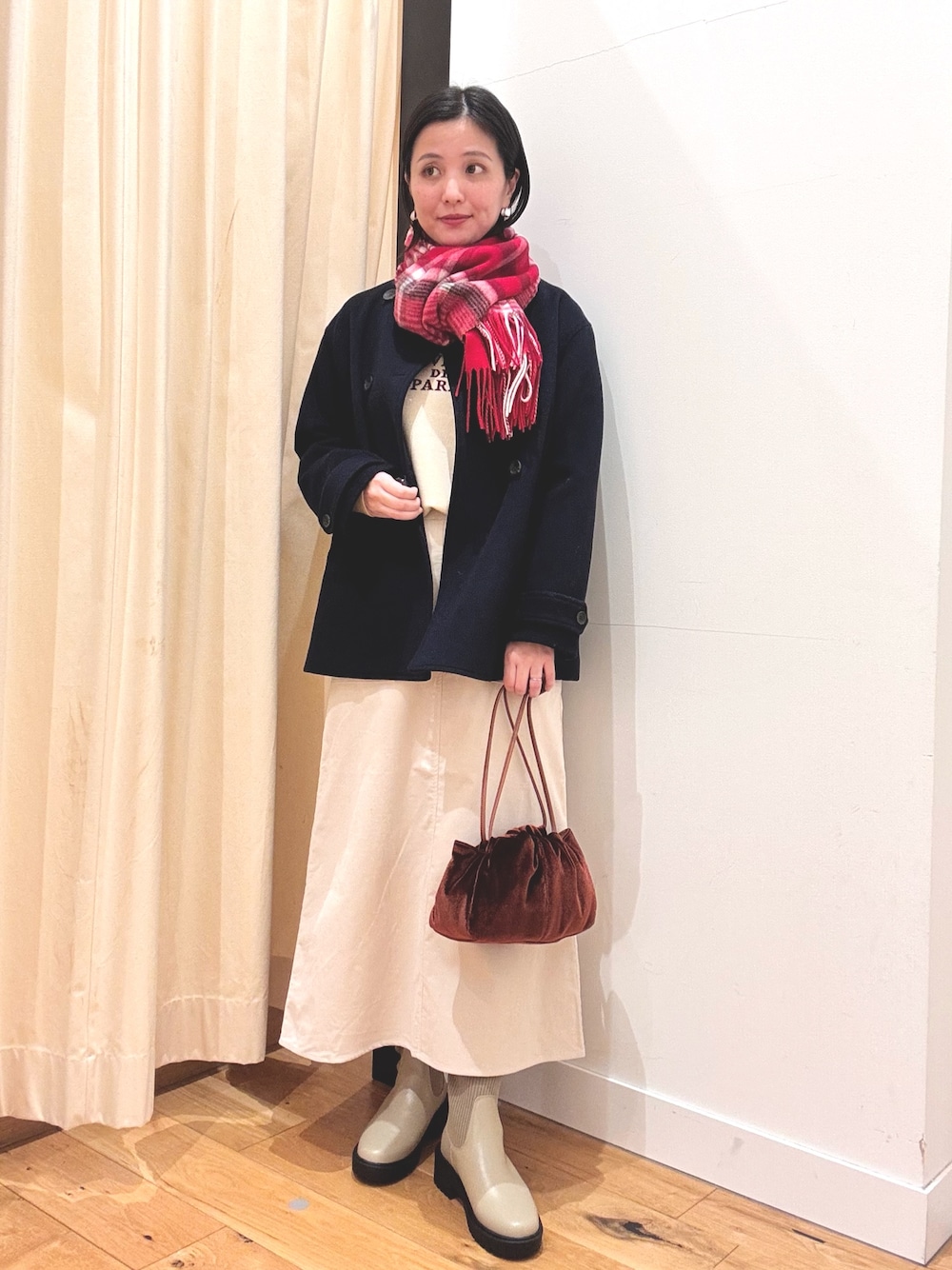 私は毎年カットソーとレイヤードするのが可愛いなぁと思いながらコーディネートしていますが、襟付きシャツなどの合わせもオススメです◎