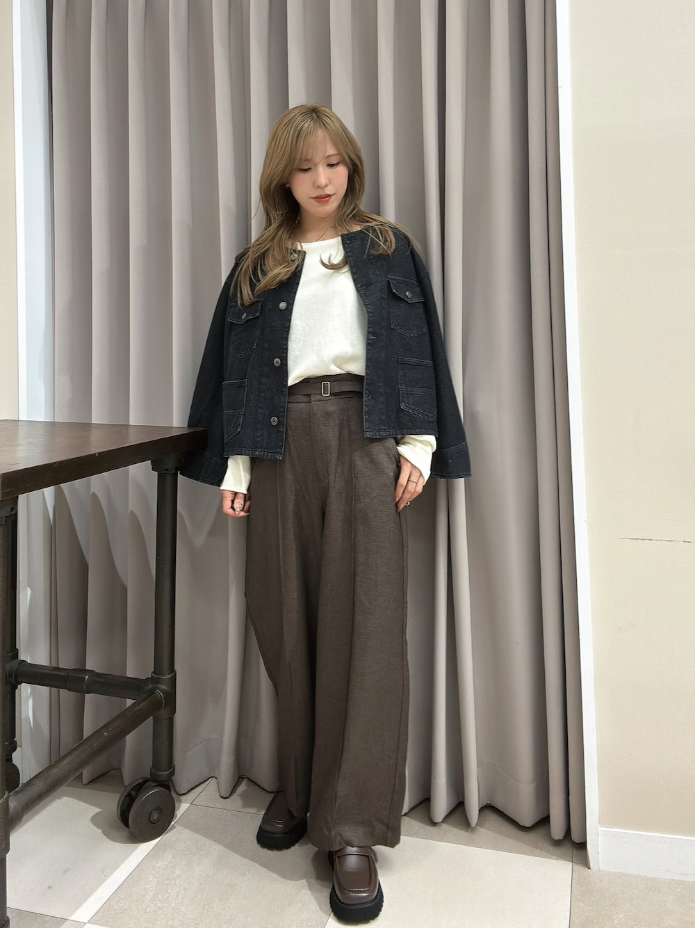 オックスのシャツで締めながらもルーズシルエットのカーディガンとデニムでラフさを。