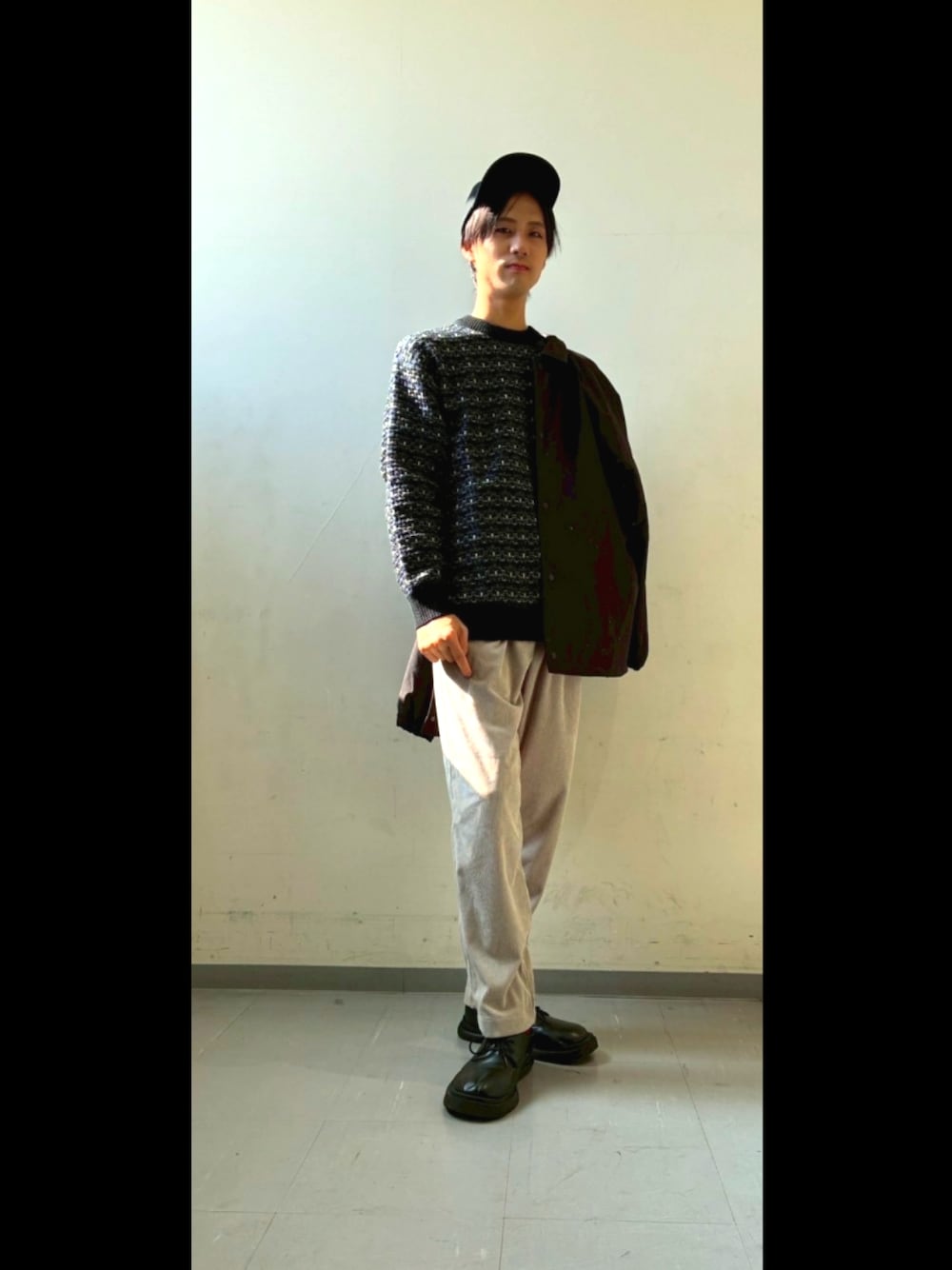 ミントグリーンのニットをアクセントにシャツとパンツでまとめました。