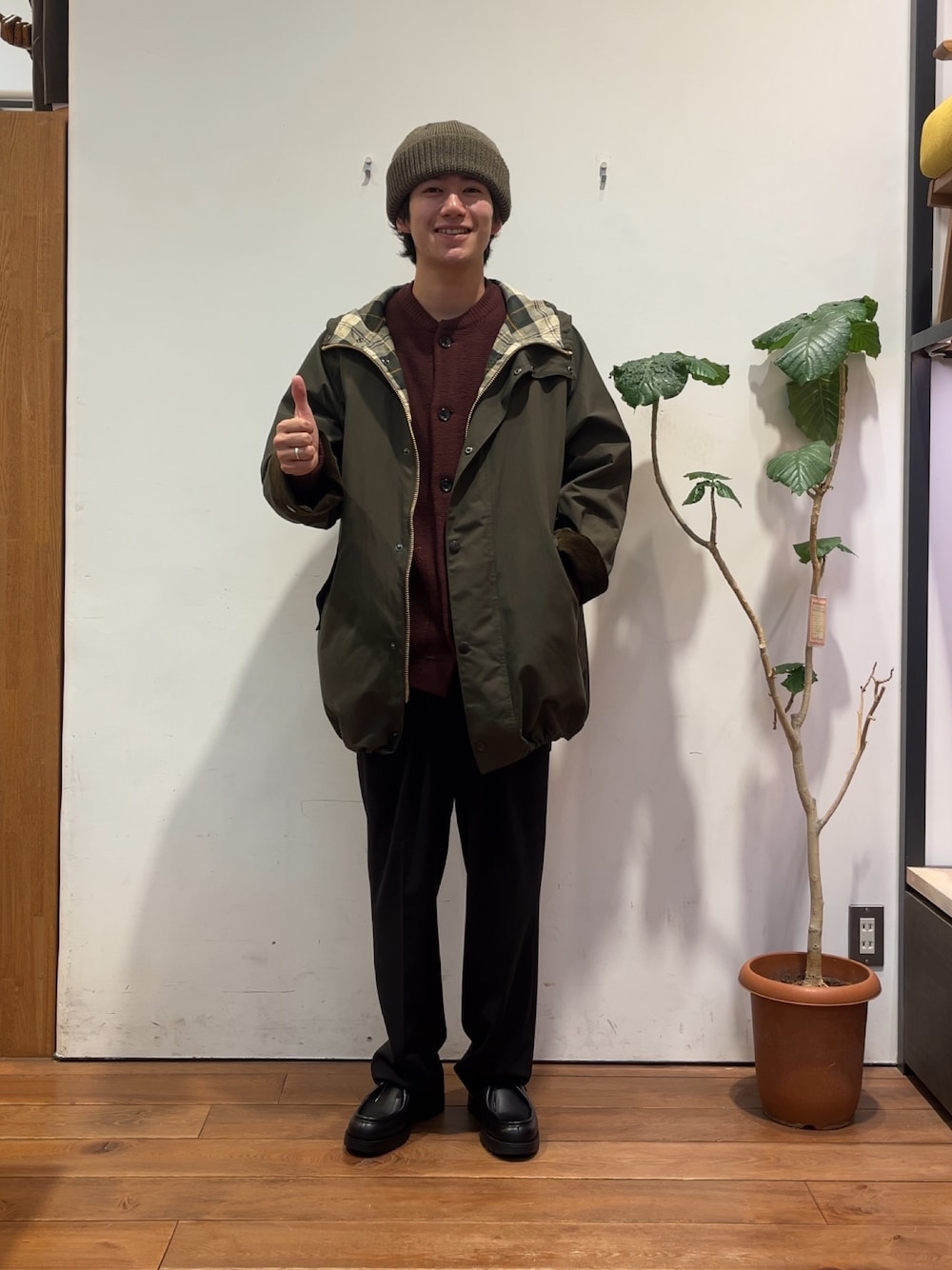チェックのコートは裏地がないのでサラッと軽めに羽織っていただけます。