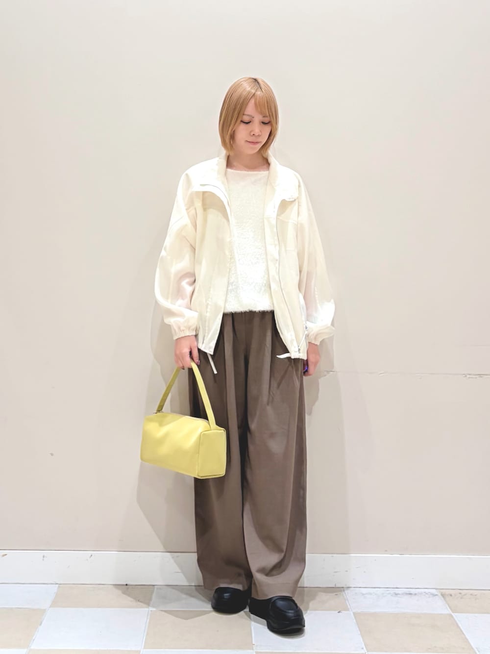 インナーはハイネックの薄手のニット、パンツはベロア素材のプリーツパンツでさらっとカジュアルに合わせました!