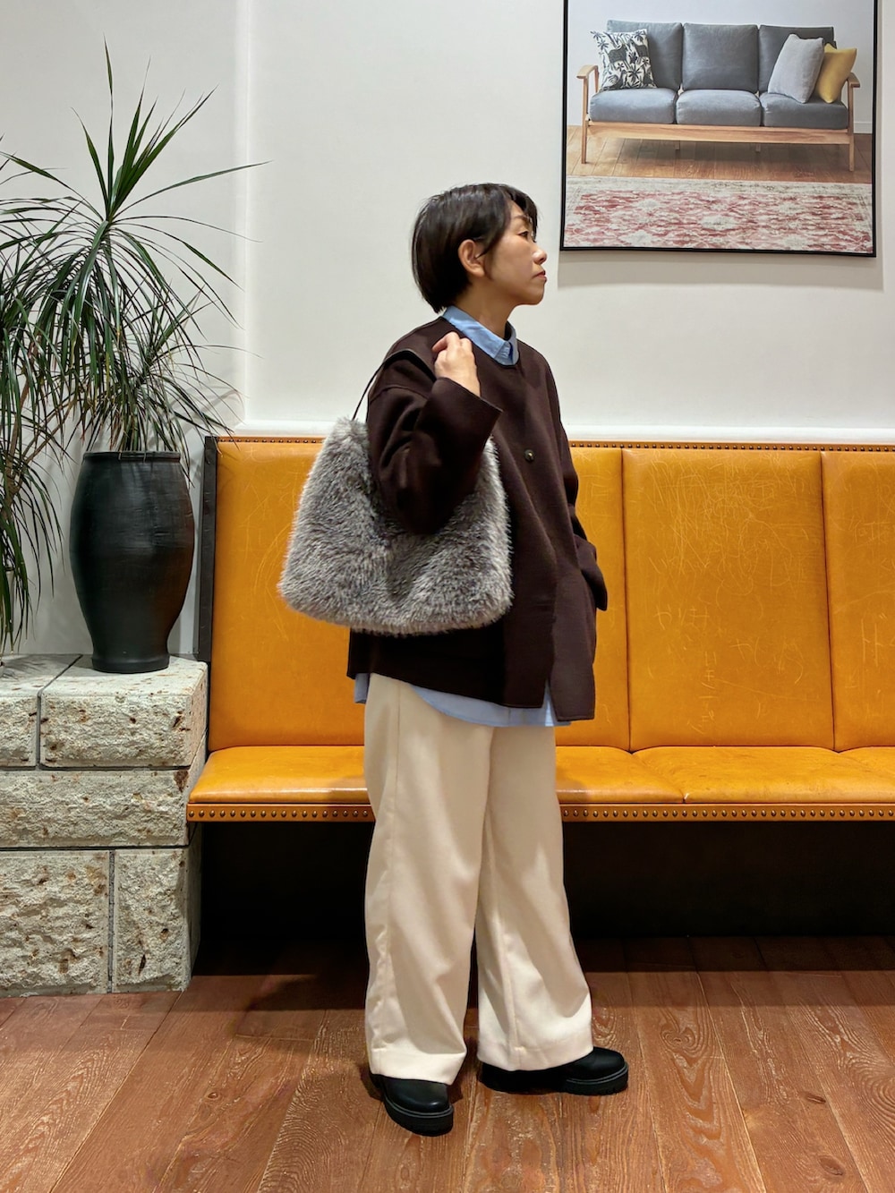 ブラウンカラーに、サックスブルーのシャツを合わせると、ぐっとオシャレさが増しますよ!