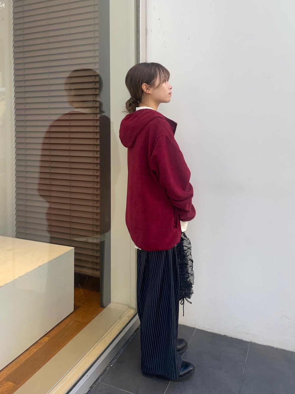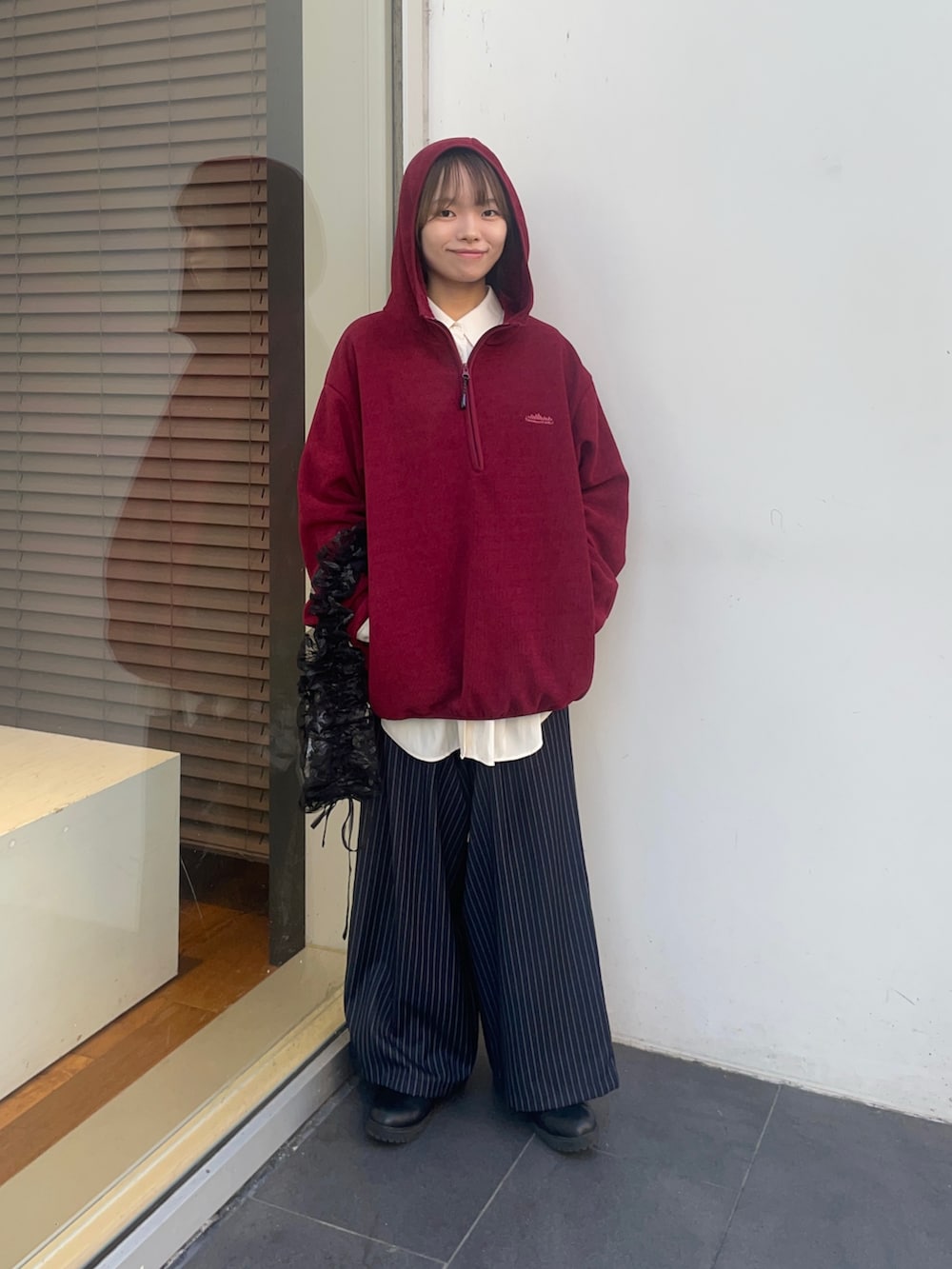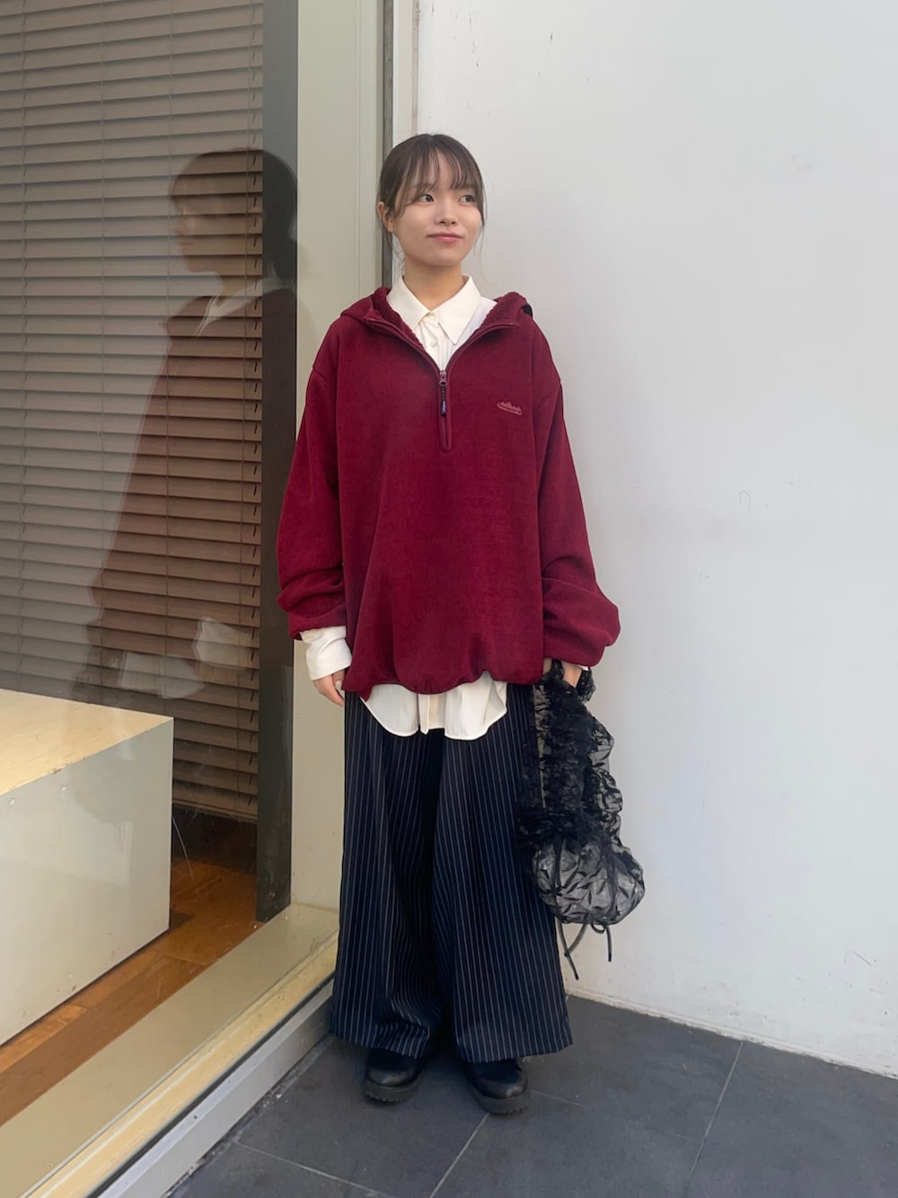 トップスのTHOUSAND MILEの赤いフリースは、黒をリアルバイしました✨サイズはゆるっと着たいので、Lサイズを購入しており、この写真の赤フリースもLサイズです!ジッパーにフード付きで、カジュアルにも使えて、中にシャツやタートル合わせたキレイめコーデにも、合いますよ!中は、起毛まではいかないですが、フワフワな素材で暖かく、今の時期はアウターとして使えます!