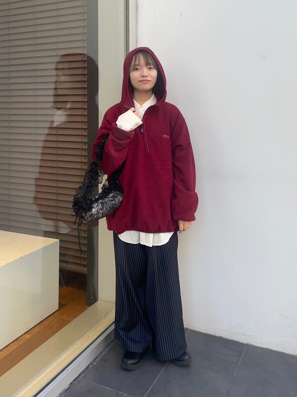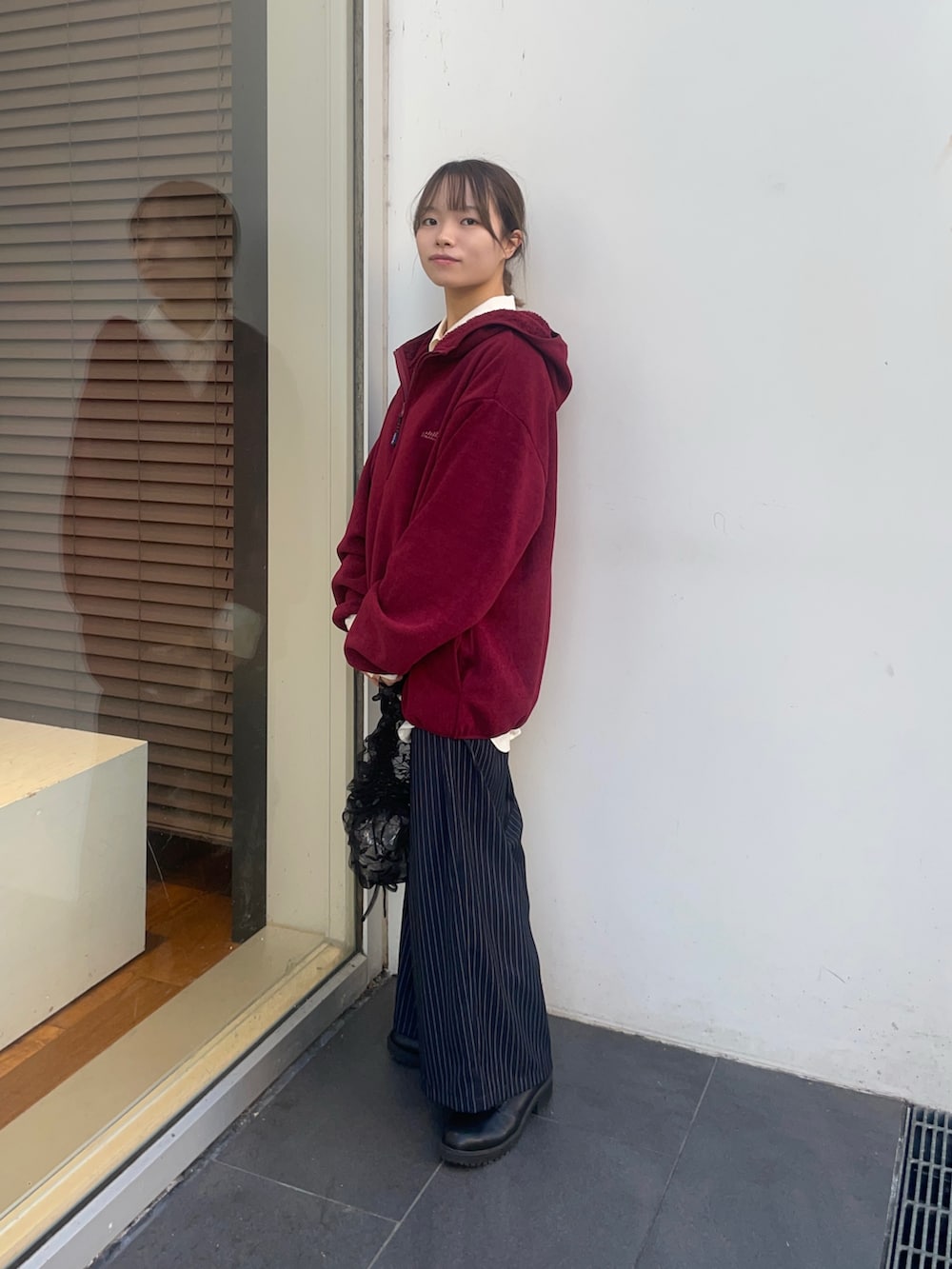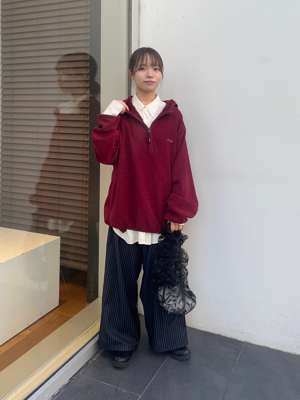 トップスのTHOUSAND MILEの赤いフリースは、黒をリアルバイしました✨サイズはゆるっと着たいので、Lサイズを購入しており、この写真の赤フリースもLサイズです!ジッパーにフード付きで、カジュアルにも使えて、中にシャツやタートル合わせたキレイめコーデにも、合いますよ!中は、起毛まではいかないですが、フワフワな素材で暖かく、今の時期はアウターとして使えます!