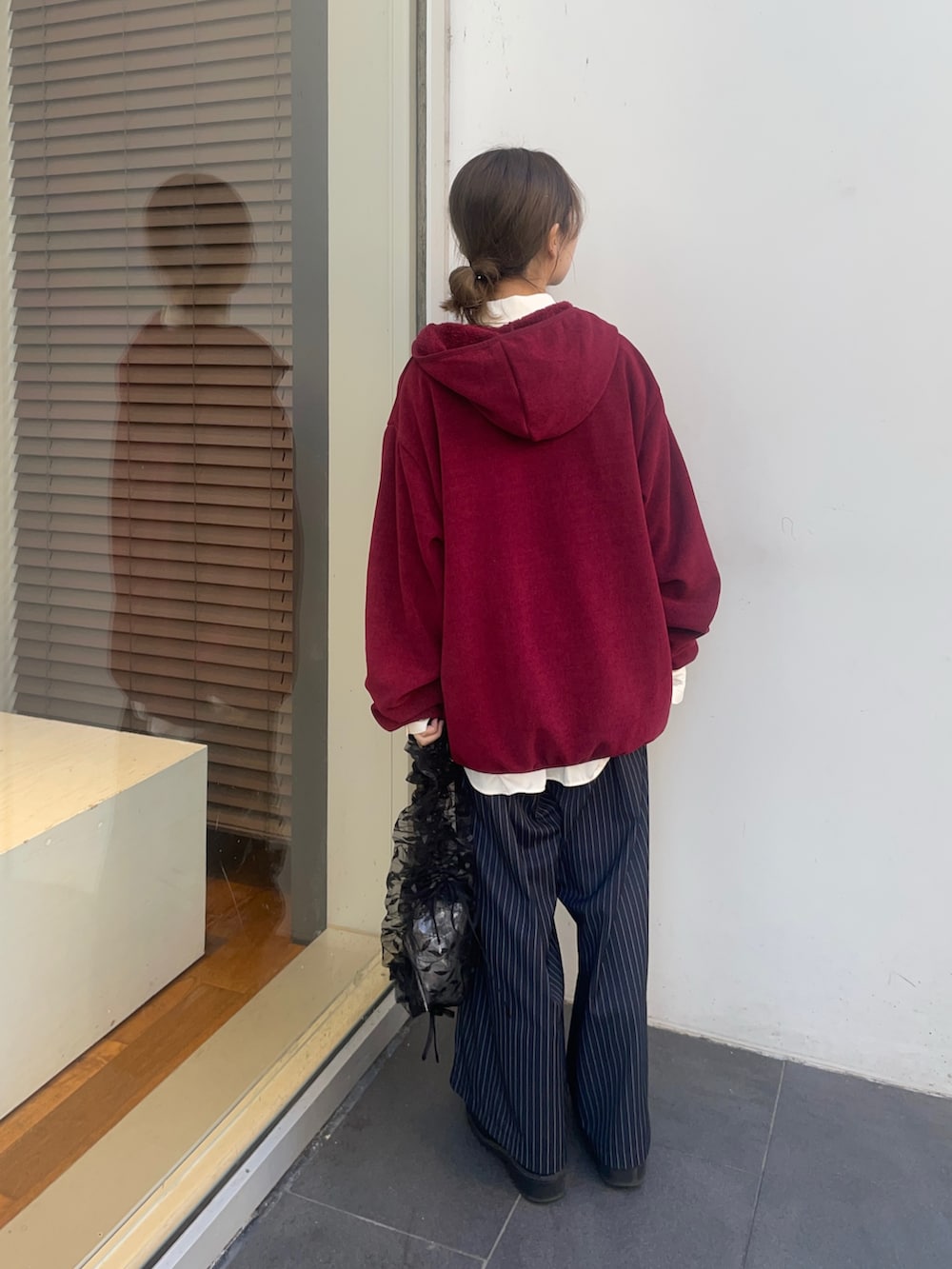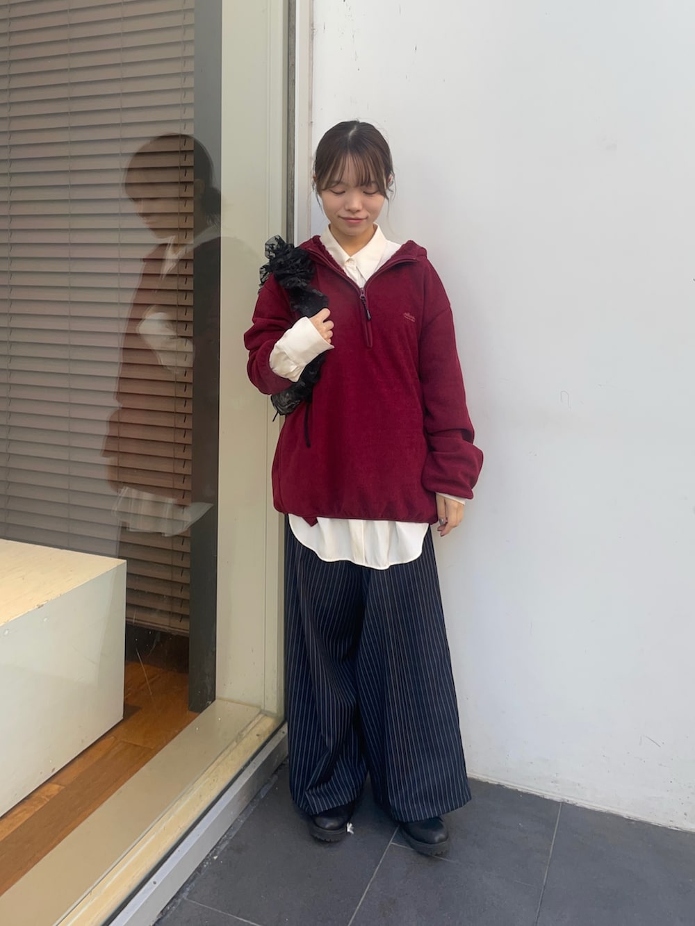 パンツはこちらもリアルバイしたタックギャザーストレートパンツで、8センチ裾上げしました!ウエストはゴム紐がついており調節可能なので、低身長の方やウエスト細身の方にもオススメなパンツです!タックがたっぷり入っているので、ワイドな形好きな方にオススメです!✨