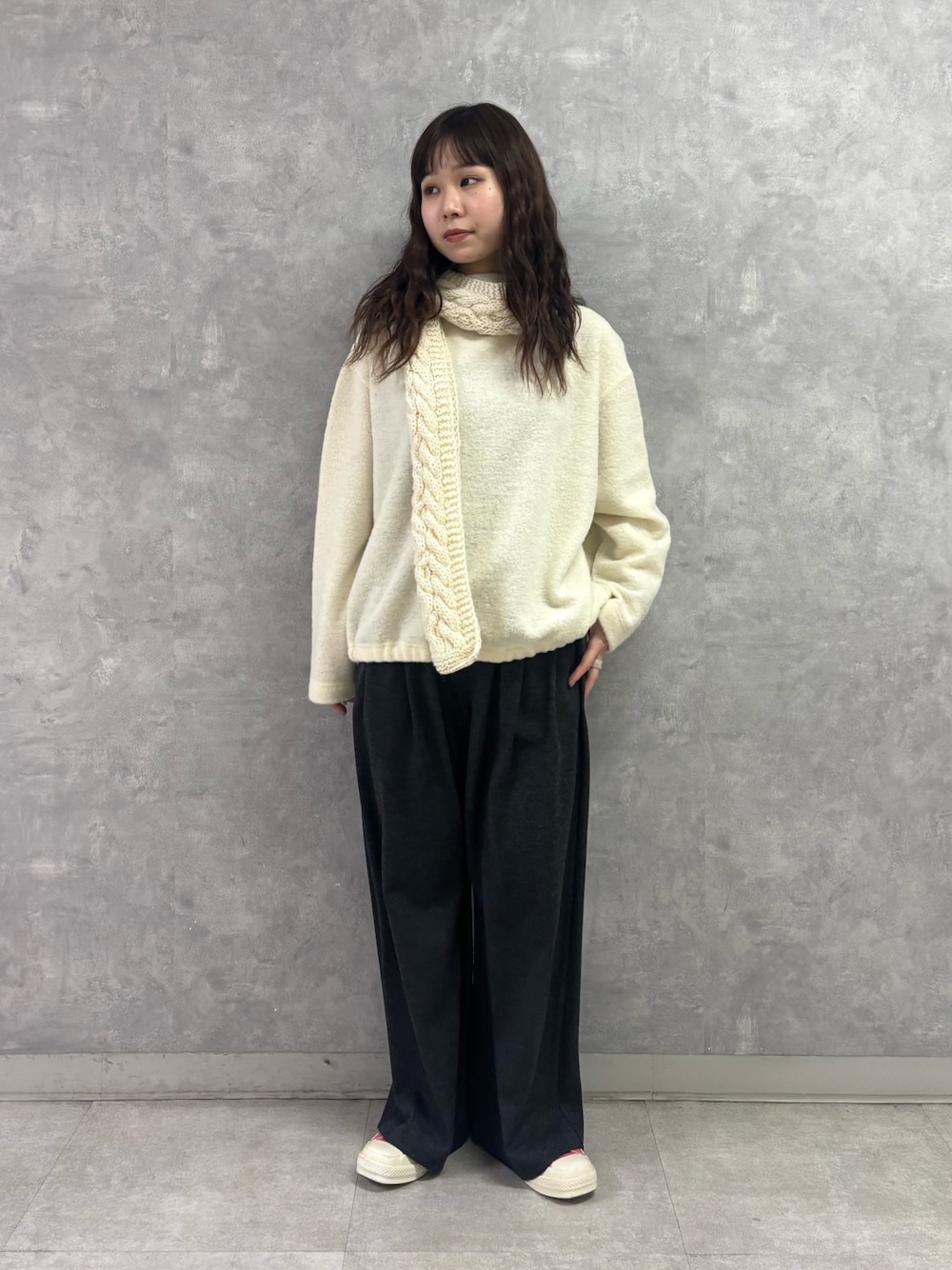 ボリュームはあってもコンパクトな印象のアウターにドレープ感の強いキュプラパンツを採用。なんとも言えない雰囲気に仕上がりました。
