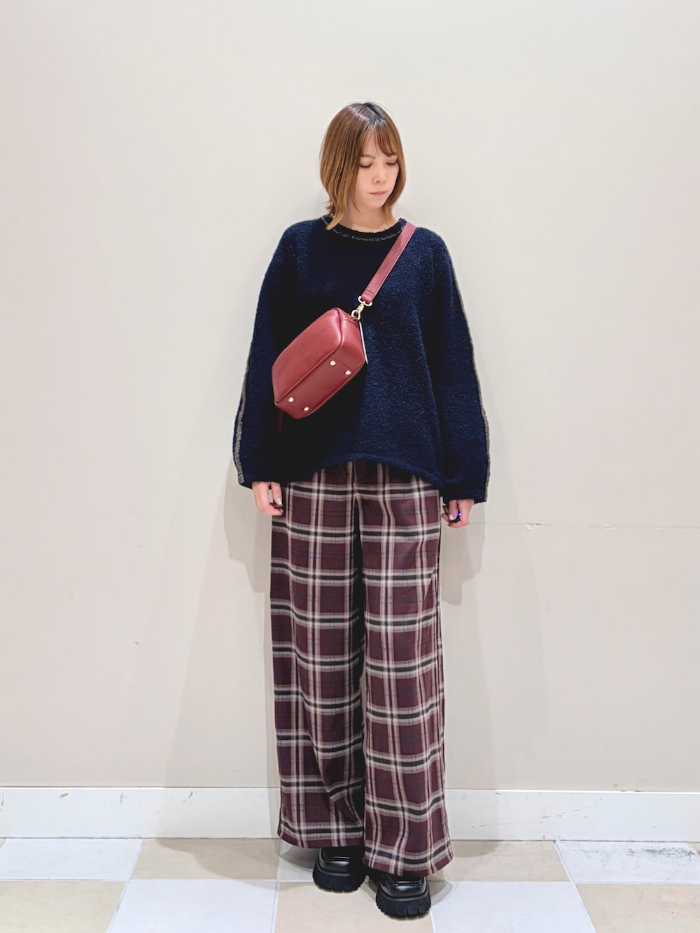 淡いカラーとふわっとした質感が可愛いニットにチェックストール、タイトスカートでコーディネートしました!