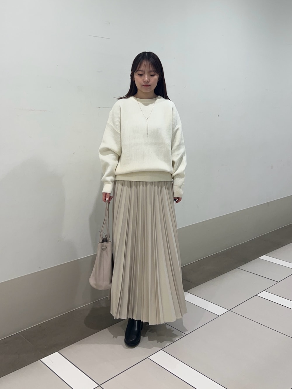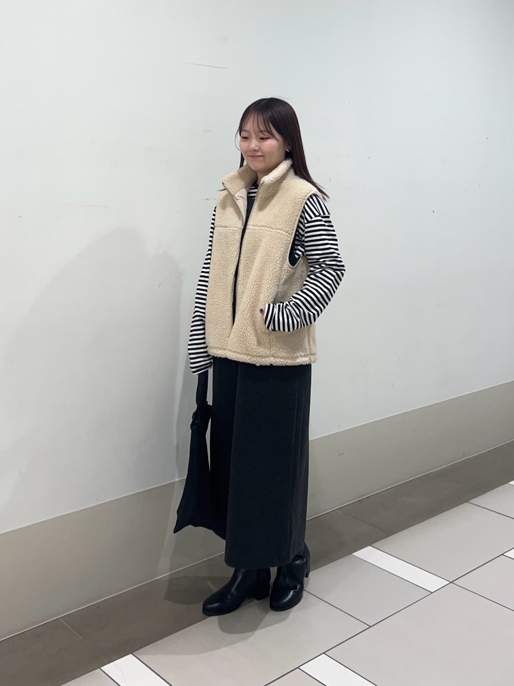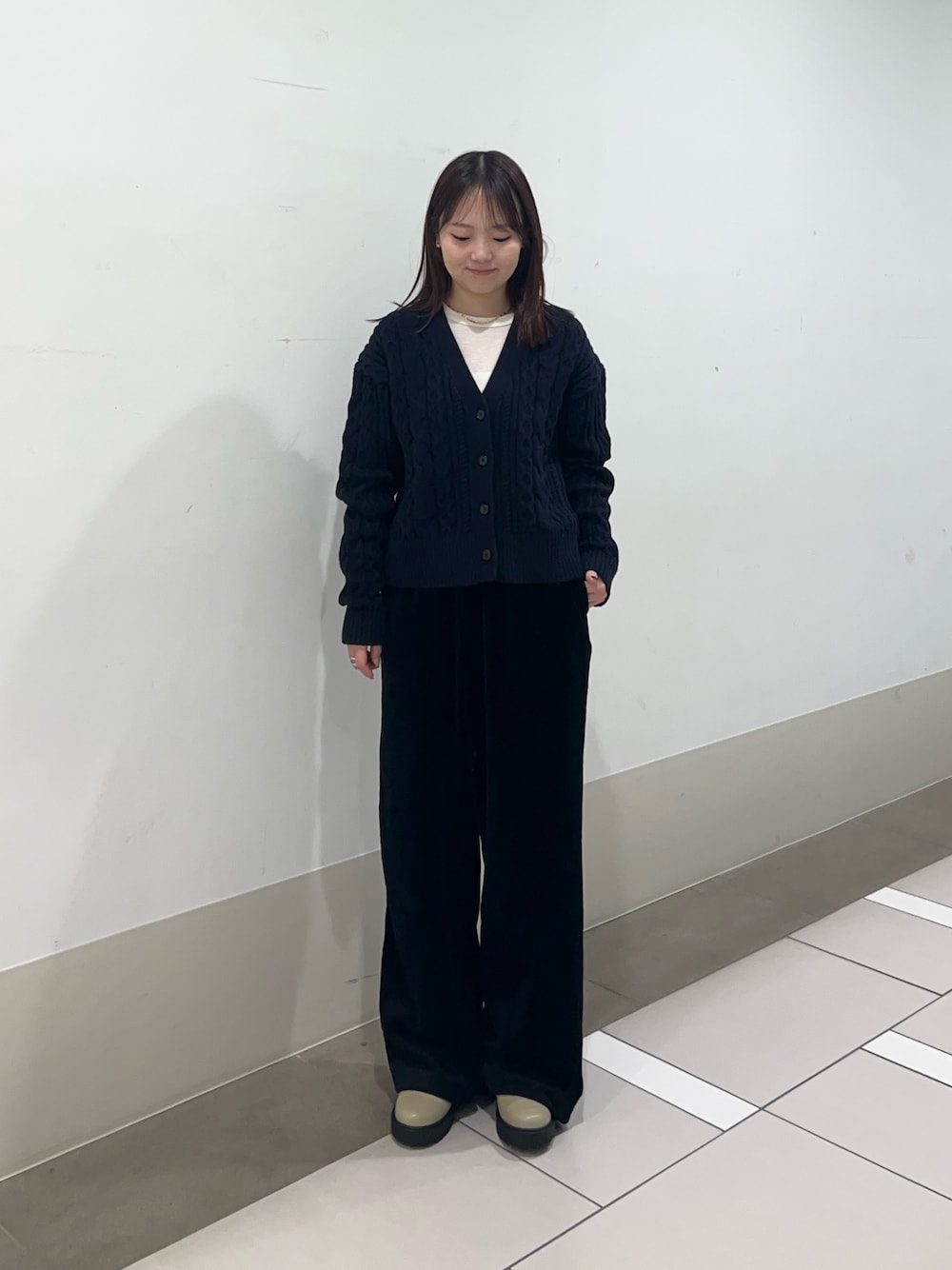 アウターのボリューム感と鮮やかな色に対し、黒のストレートまたはワイドパンツと黒のシューズで全体をシックに引き締めています。