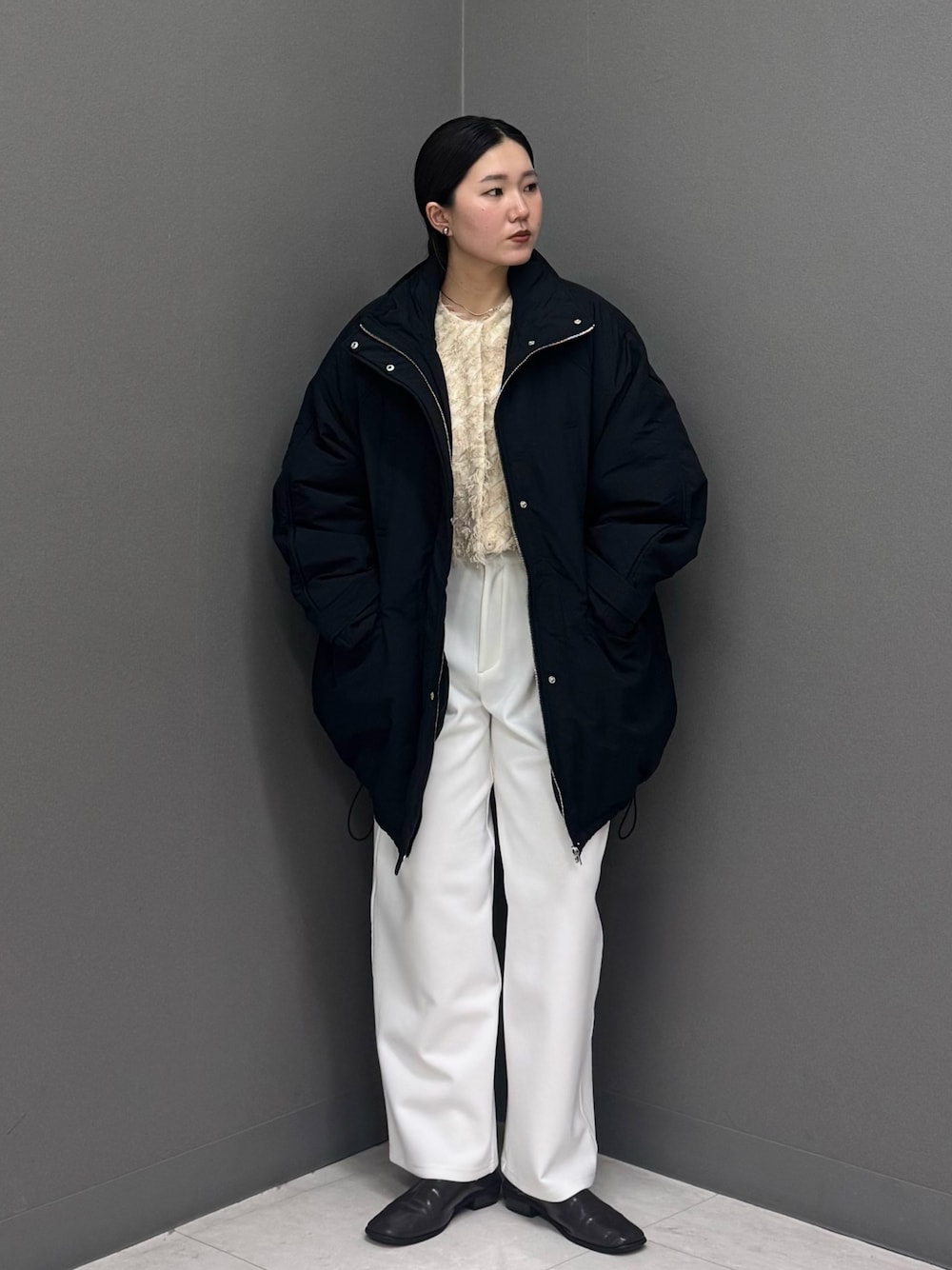 パンツも暖かみのあるウールライク素材を合わせてセットアップ風に