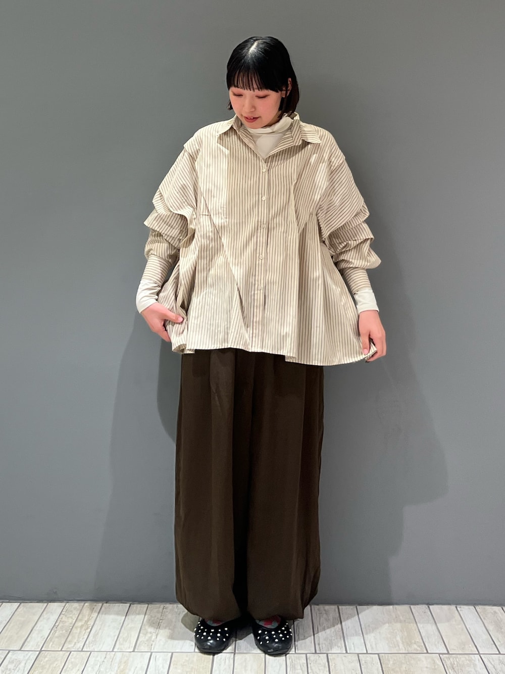 履いてみた感じ、サイズ展開がS・Mなのですが、ウエスト周りが少しタイトなので下腹が出てきた私はMサイズがジャストサイズでした( ◠‿◠ )長さは少し裾が床に着くぐらいなので、ボリューム感のあるスニーカーで裾をたゆませたり、キレイめブーツでスッキリ見せたりと色んな着丈ができそうでした🫶🏻